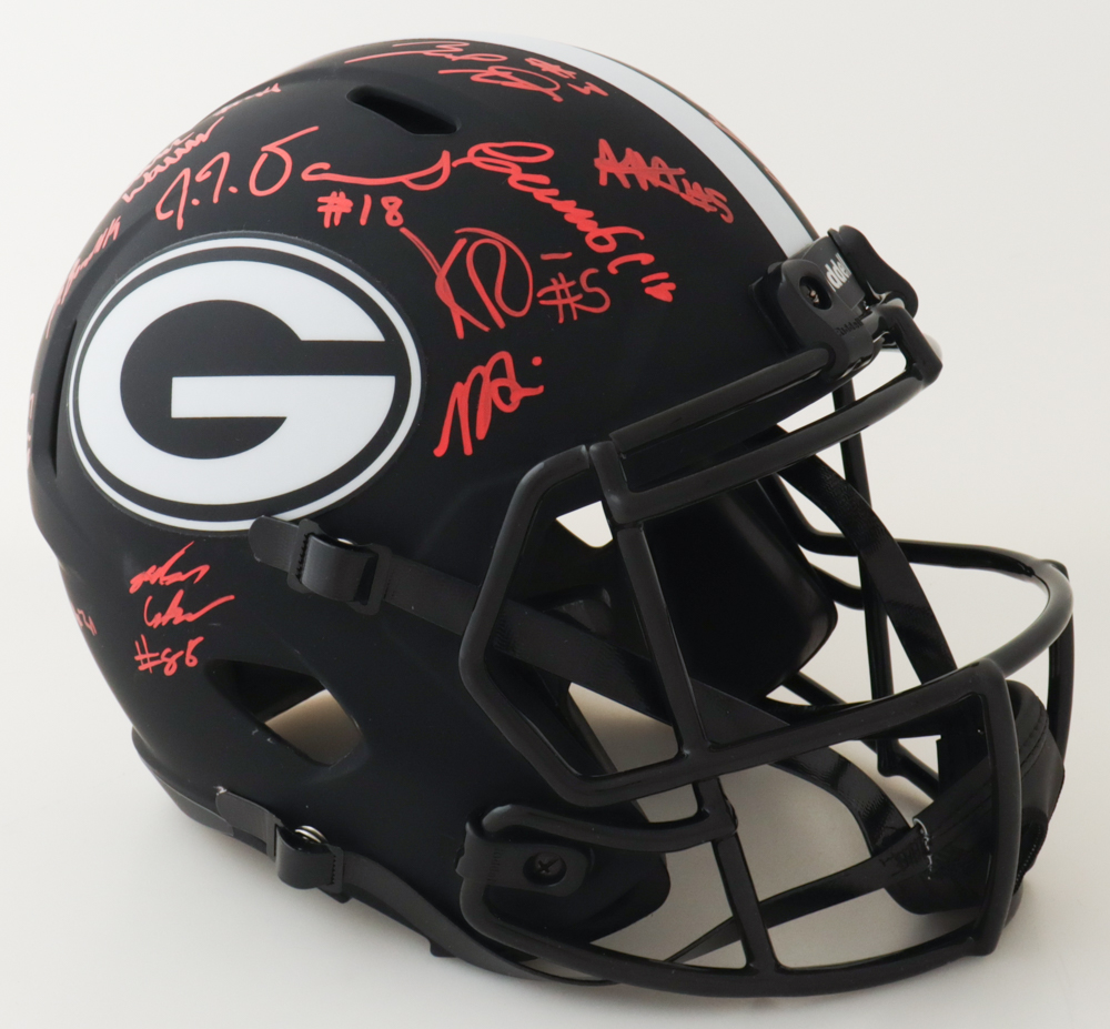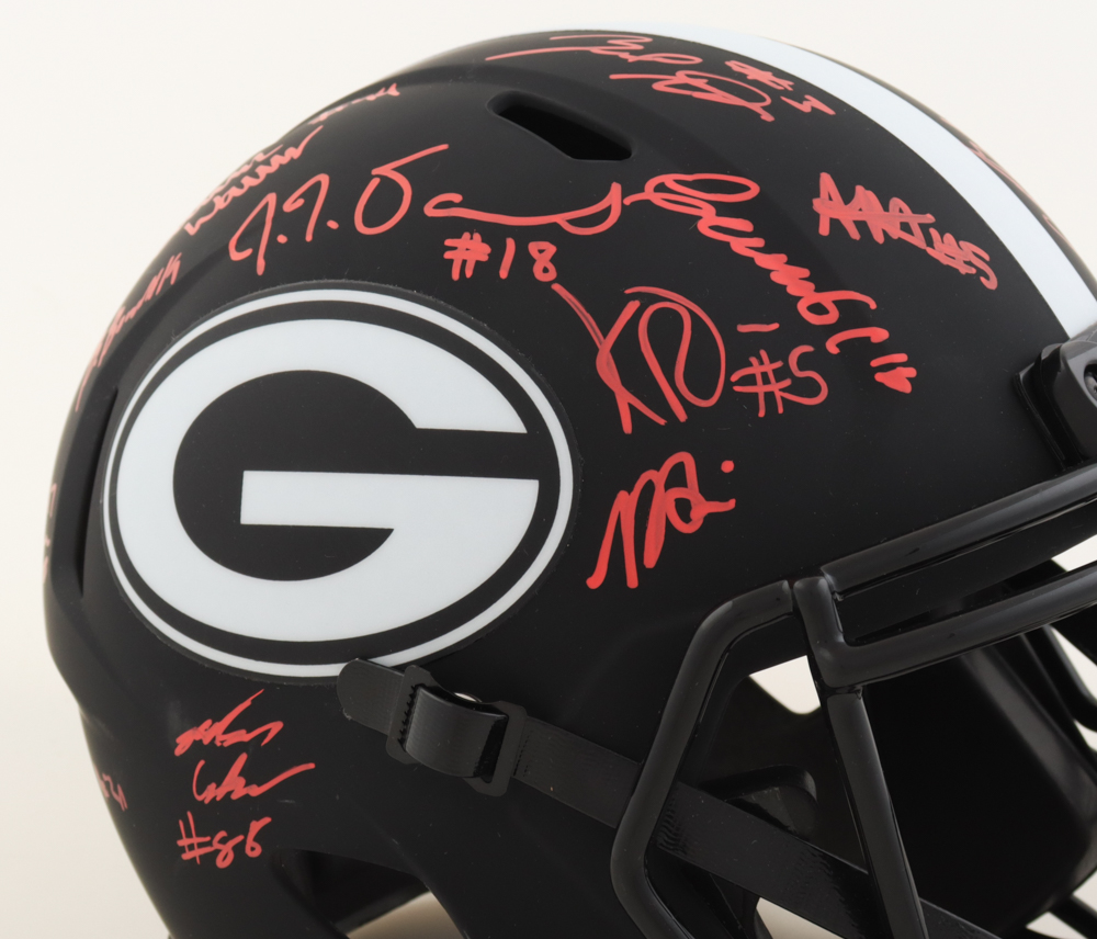 Riddell Georgia Bulldogs full-size Speed replica helmet. Hand-signed by (23) members of the 2021 National Championship winning team including Stetson Bennett, George Pickens, Zamir White, Lewis Cine, Kelee Ringo, Travon Walker, Nakobe Dean, Jalen Carter, Jermaine Burton, Devonte Wyatt, Kenny McIntosh, James Cook, Nolan Smith Jr., Quay Walker, Marcus Rosemy-Jacksaint, Kearis Jackson, Kendall Milton, Darnell Washington, Justin Shaffer, Christopher Smith, William Poole, Derion Kendrick, and (1) other.