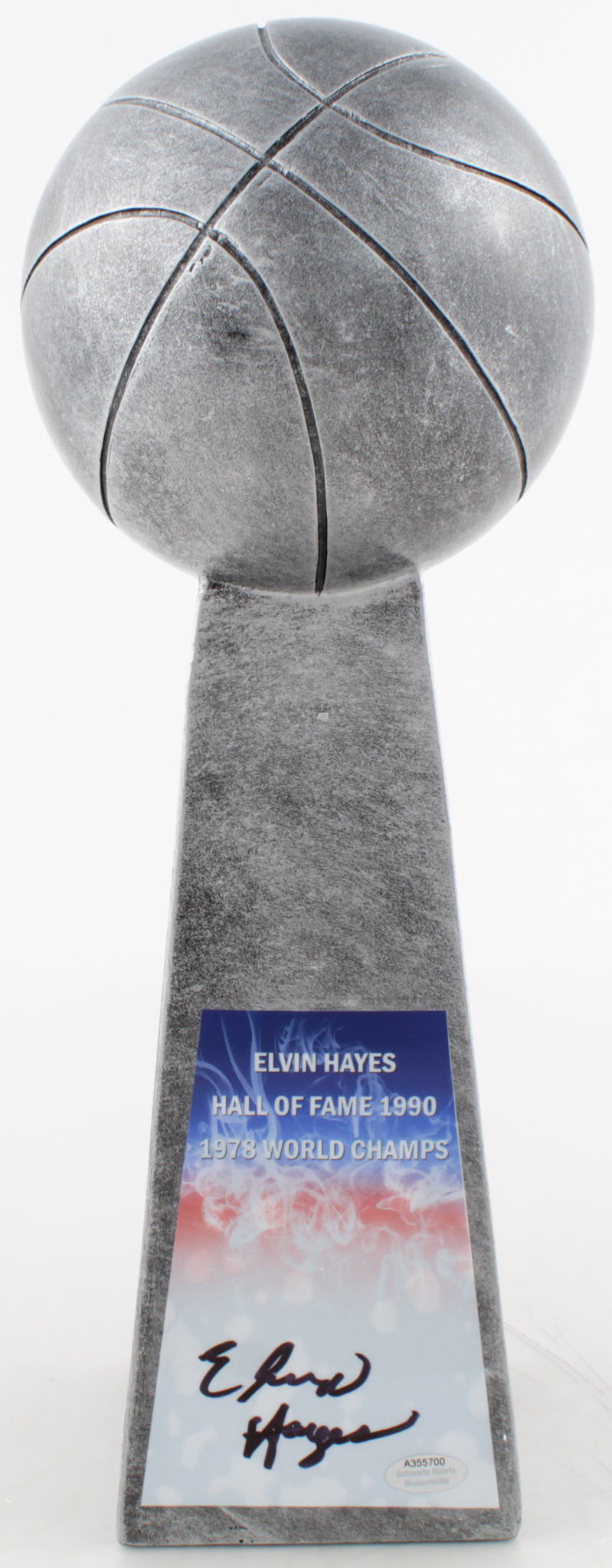 Replica championship trophy measures approximately 14" in height and has been hand-signed by Elvin Hayes (Washington Bullets, HOF).