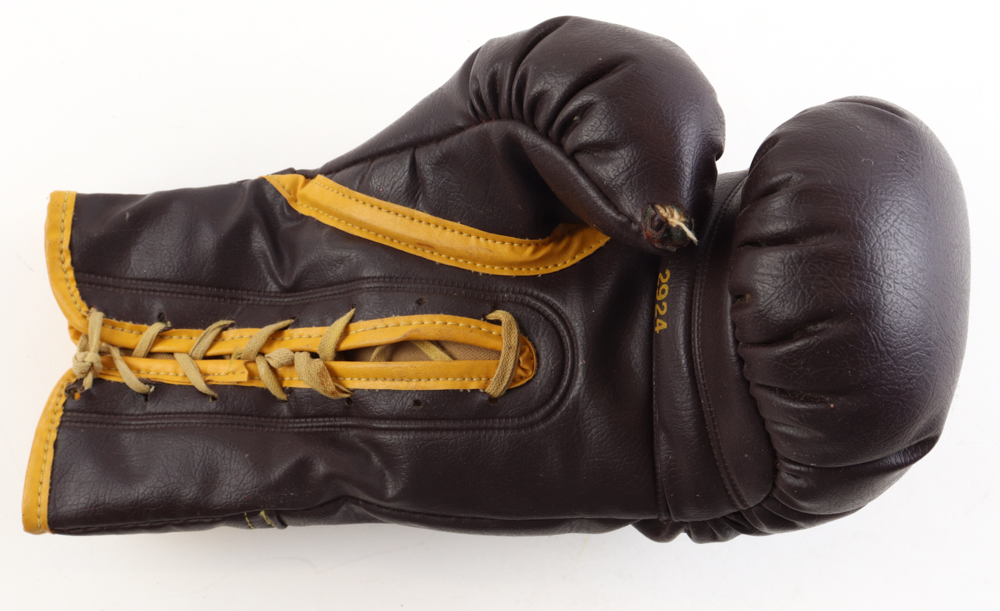 Pair of Vintage Popeye Everlast Leather boxing gloves. The left glove has been hand-signed by Mike Tyson (HOF). Includes display case as shown.