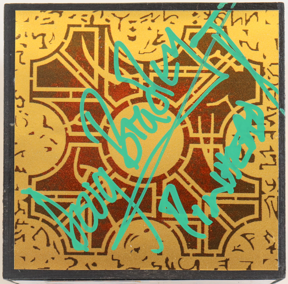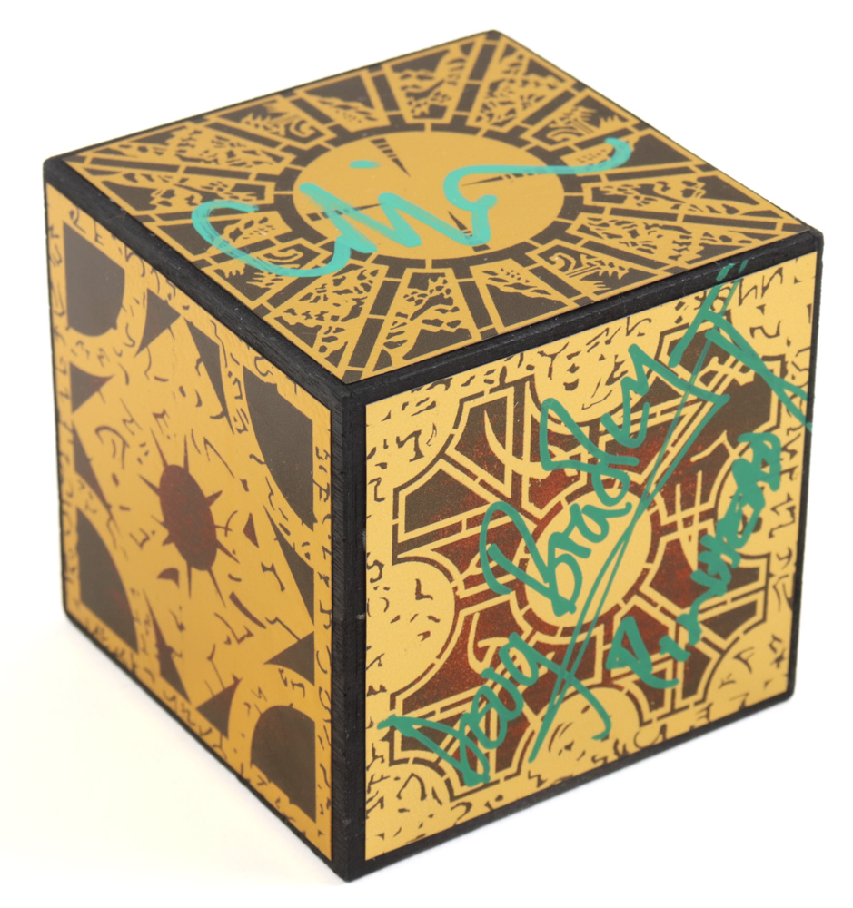 Puzzle Box measures approximately 3" x 3" x 3" in dimension. Hand-signed and inscribed by Doug Bradley (Cenobite "Pinhead") and Clive Barker (Author).