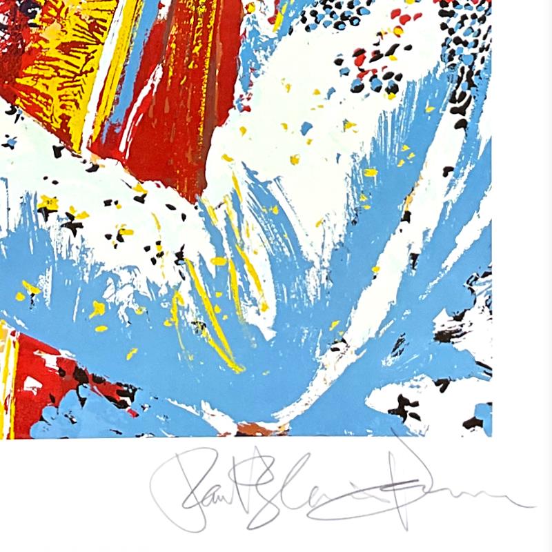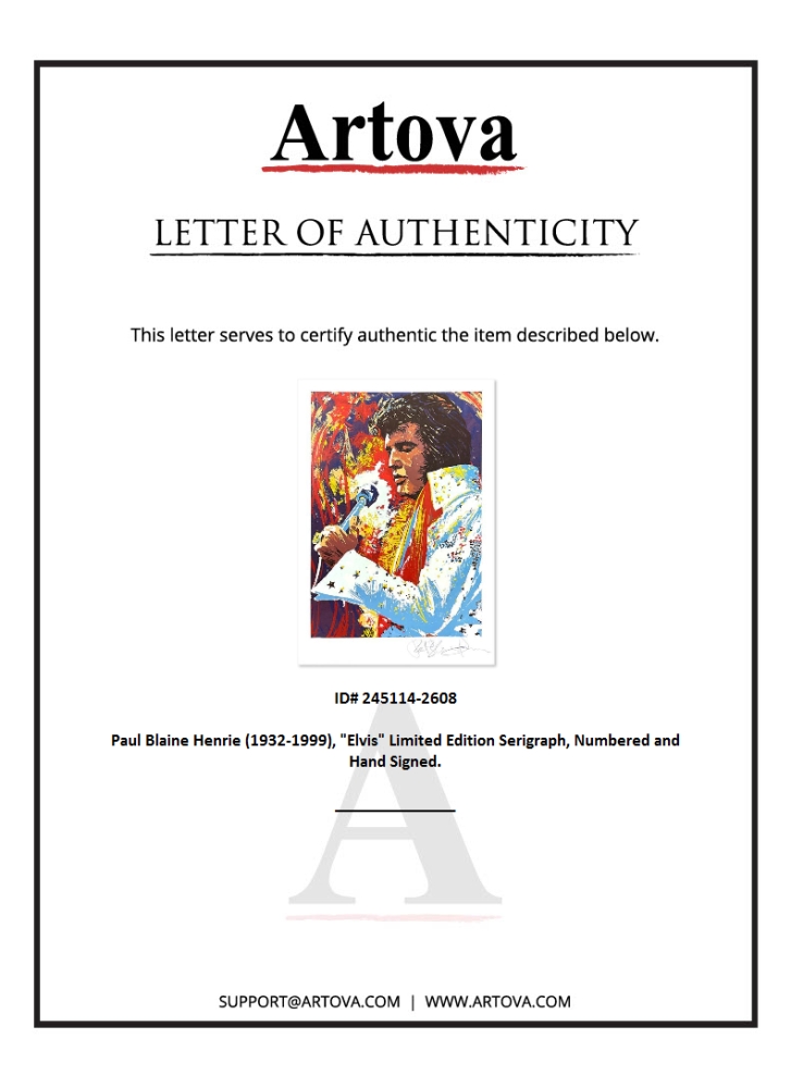 "Elvis" is a limited edition serigraph on paper by Paul Blaine Henrie (1932-1999), numbered and hand-signed by the artist. Includes Letter of Authenticity. Measures approx. 20" x 26" (border); 14" x 20" (image). Please note: Due to the age of this piece there may be minor discoloration, minor creases or smudges in the border area.