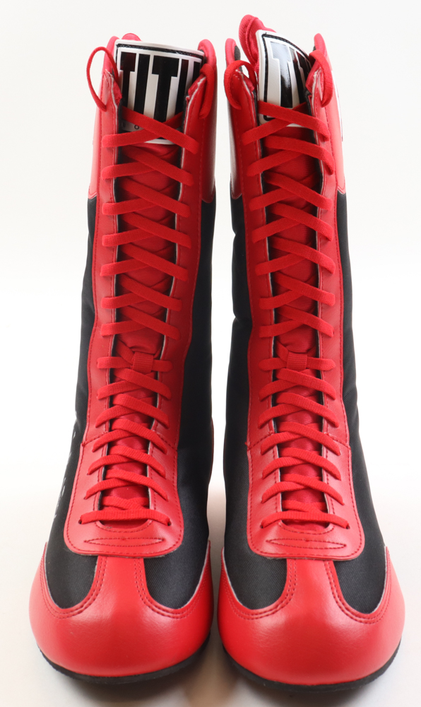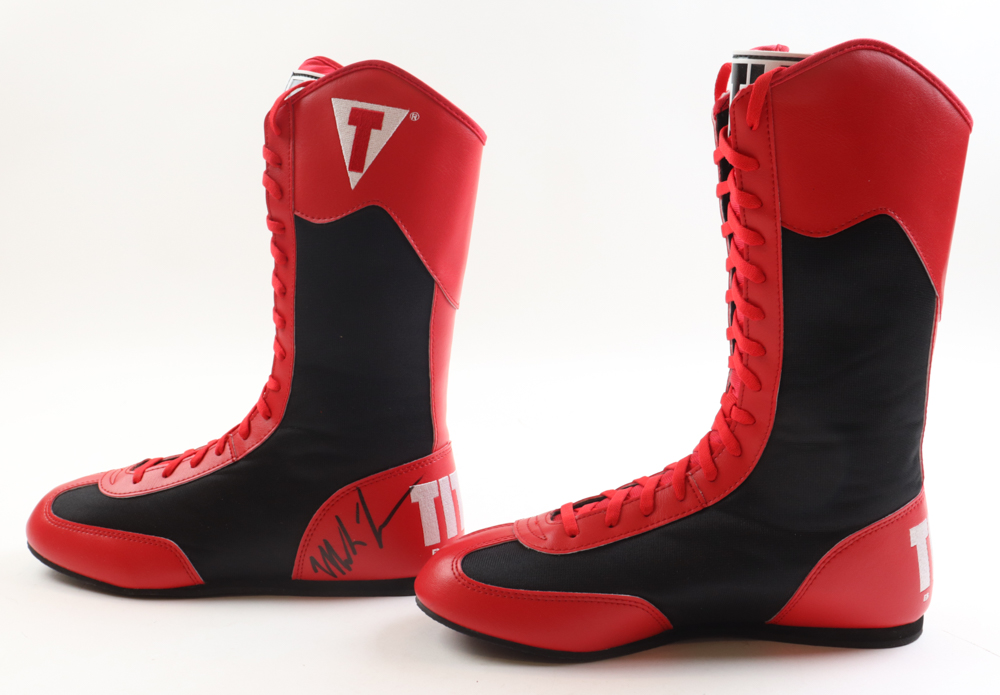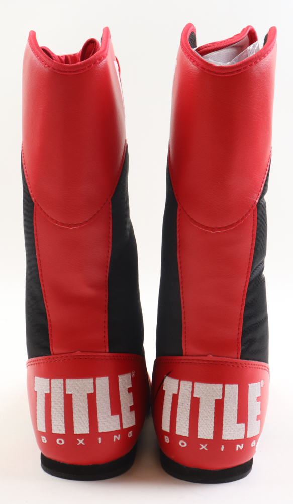 Pair of (2) Title Boxing boots, size 8. The pair of boots have been hand-signed and inscribed by Mike Tyson (HOF) and Leon Spinks (HOF).