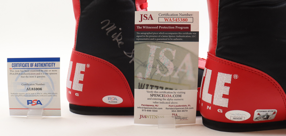 The lot / autograph(s) includes an official PSA/DNA hologram and matching COA, an official James Spence Authentication (JSA) hologram and matching COA as well as an official Mike Tyson hologram from Fiterman Sports for authenticity purposes. The signing of this item was witnessed by JSA.