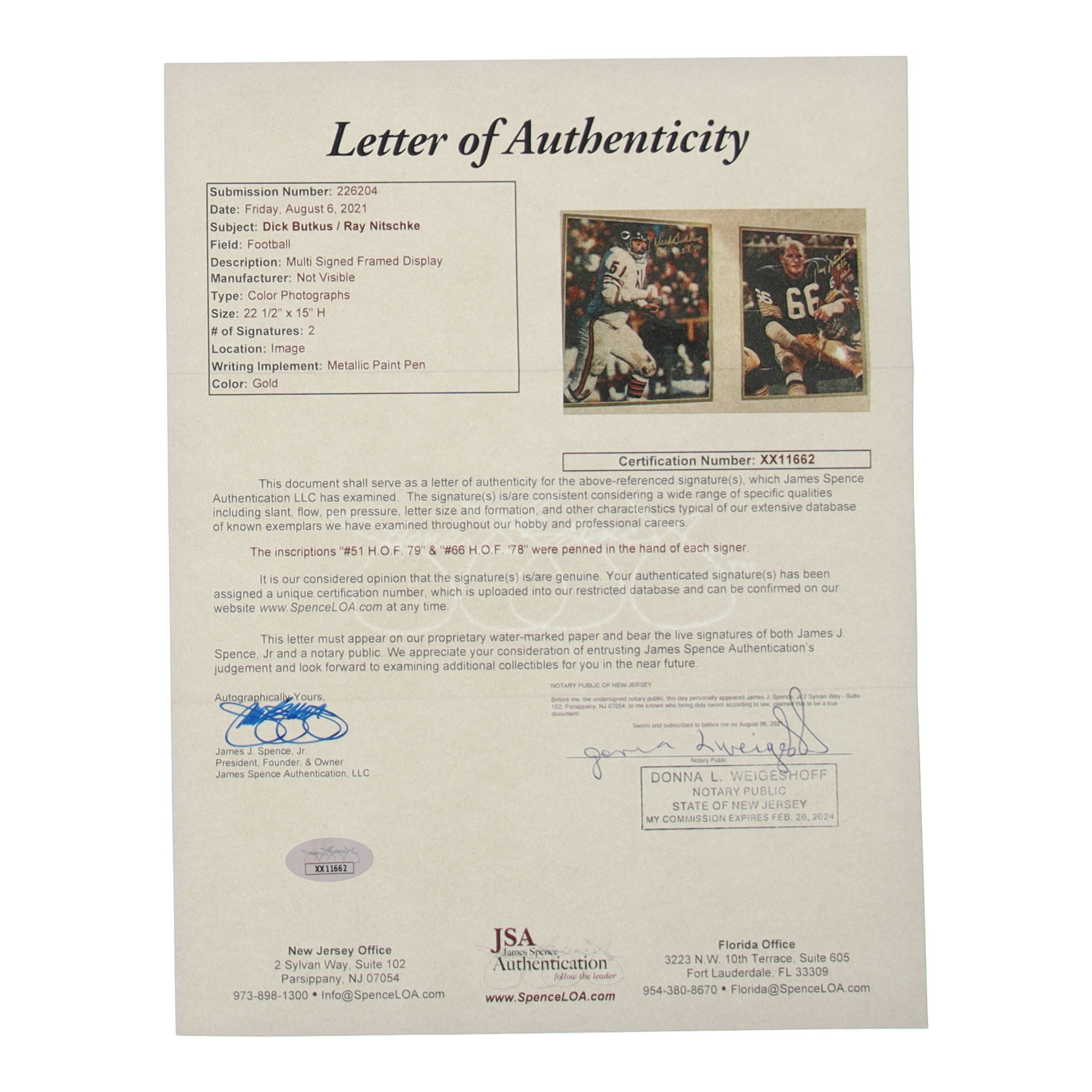 The autograph includes an official James Spence Authentication (JSA) hologram and matching LOA for authenticity purposes.