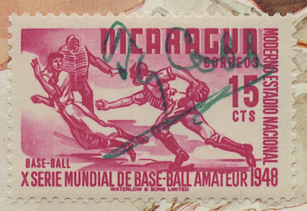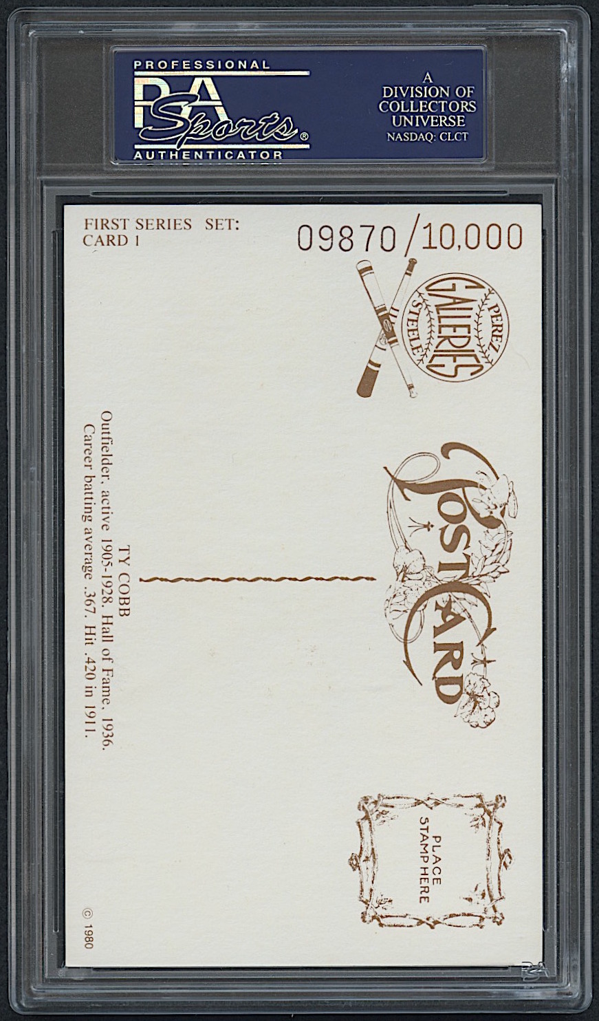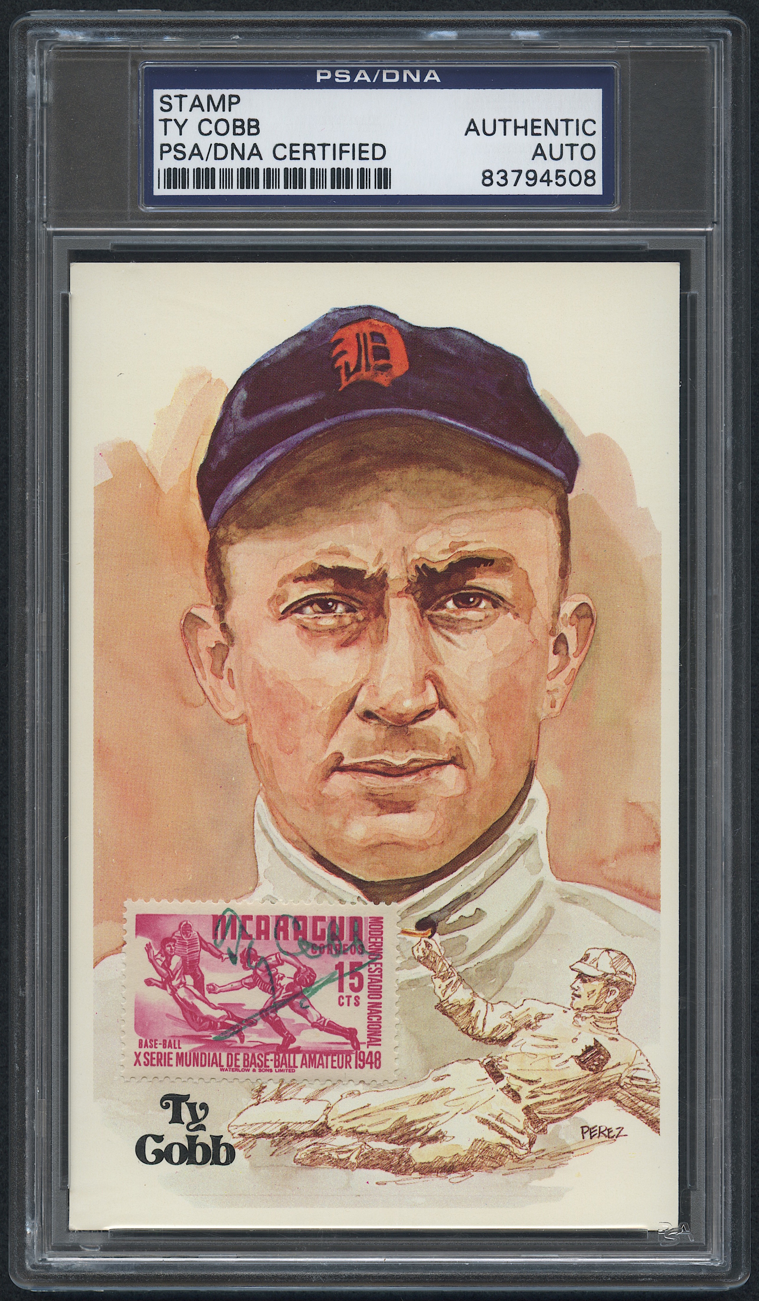 Vintage baseball themed postage stamp hand-signed in green ink by Ty Cobb (D 1961). The stamp is affixed to a limited edition Perez-Steele HOF postcard.