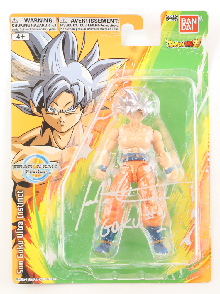 Figure measures approximately 5" tall and has been hand-signed and inscribed on the packaging by Ian James Corlett (Goku).