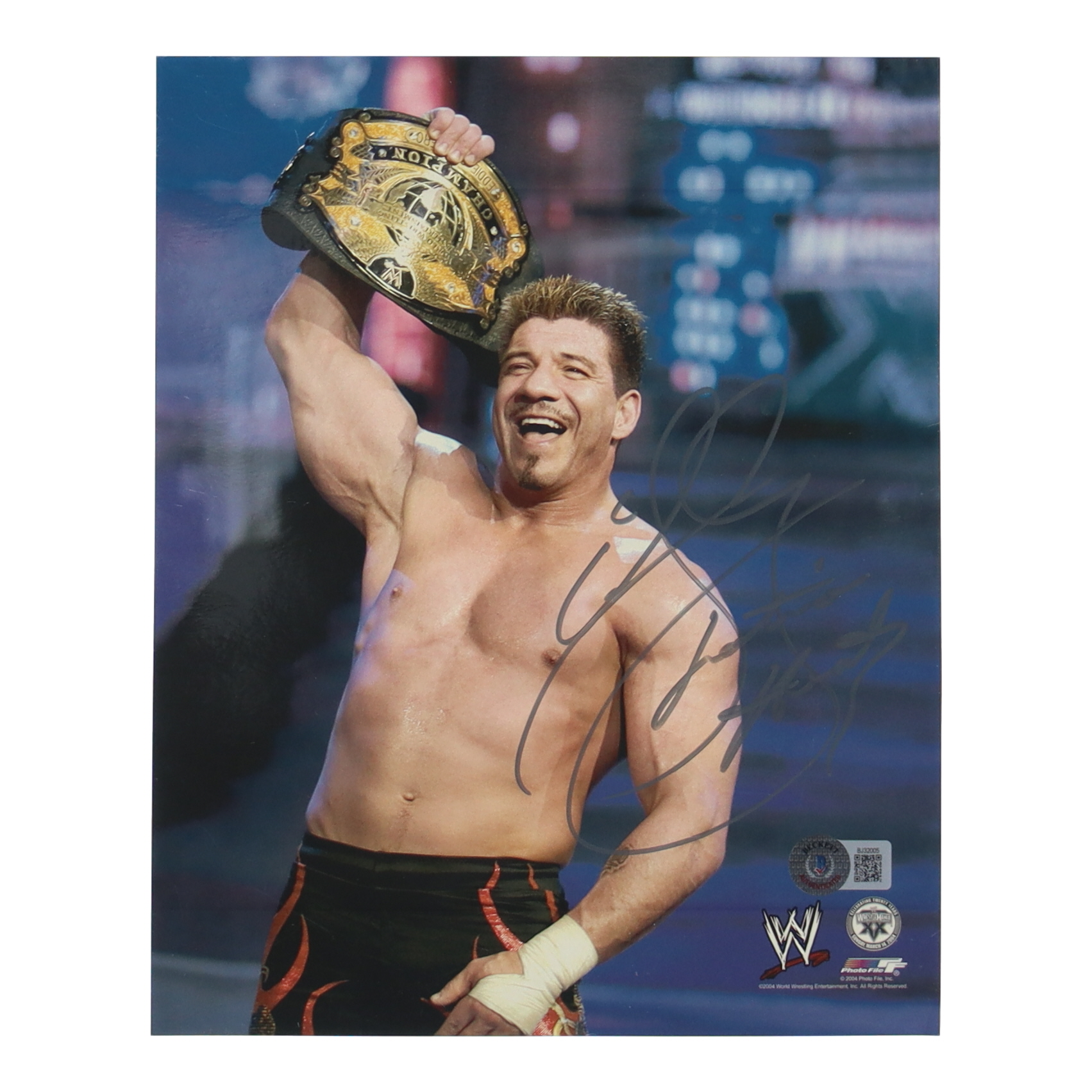 Photo measures 8" x 10" in size and has been hand-signed and inscribed by Eddie Guerrero (D. 2005, HOF).