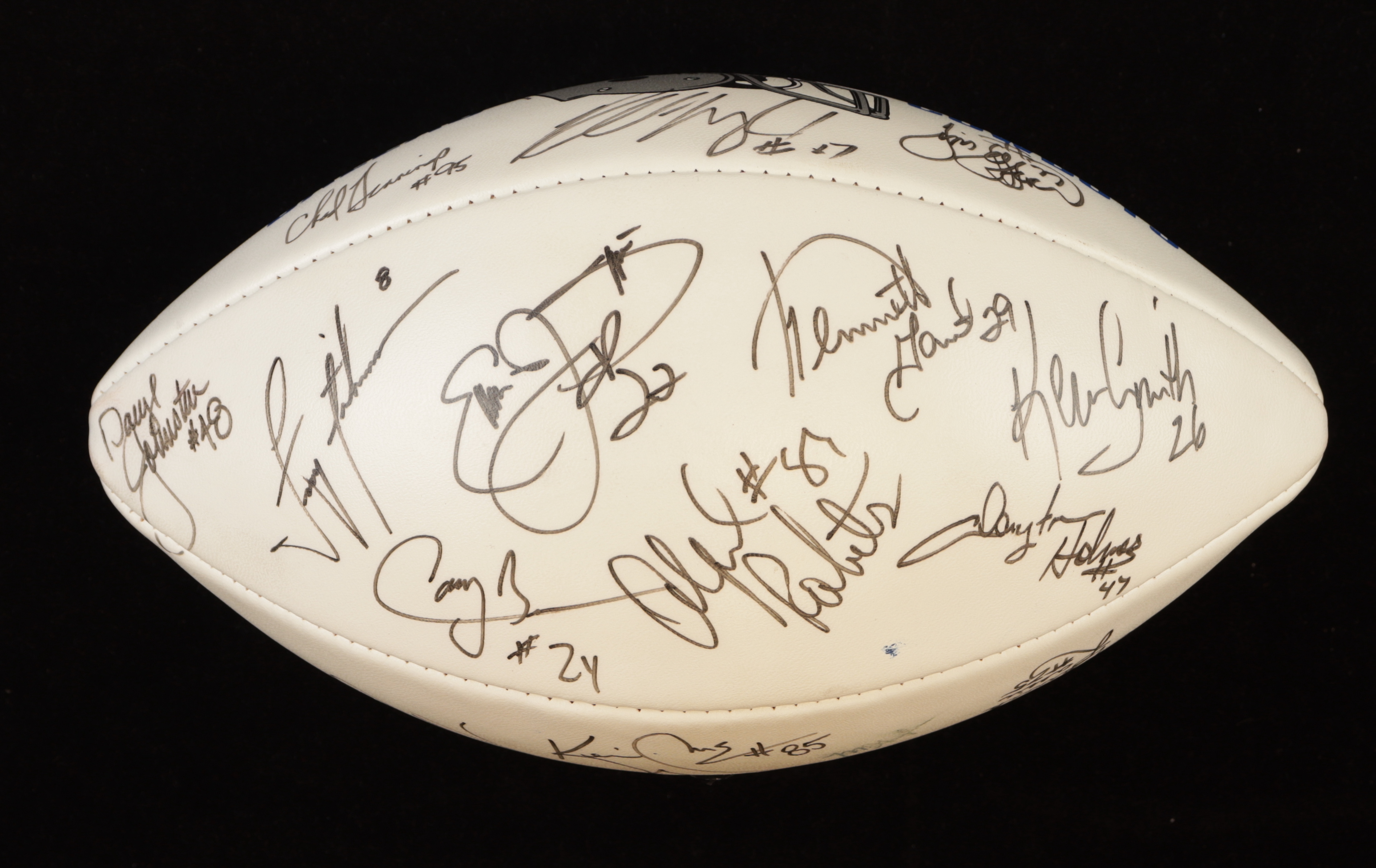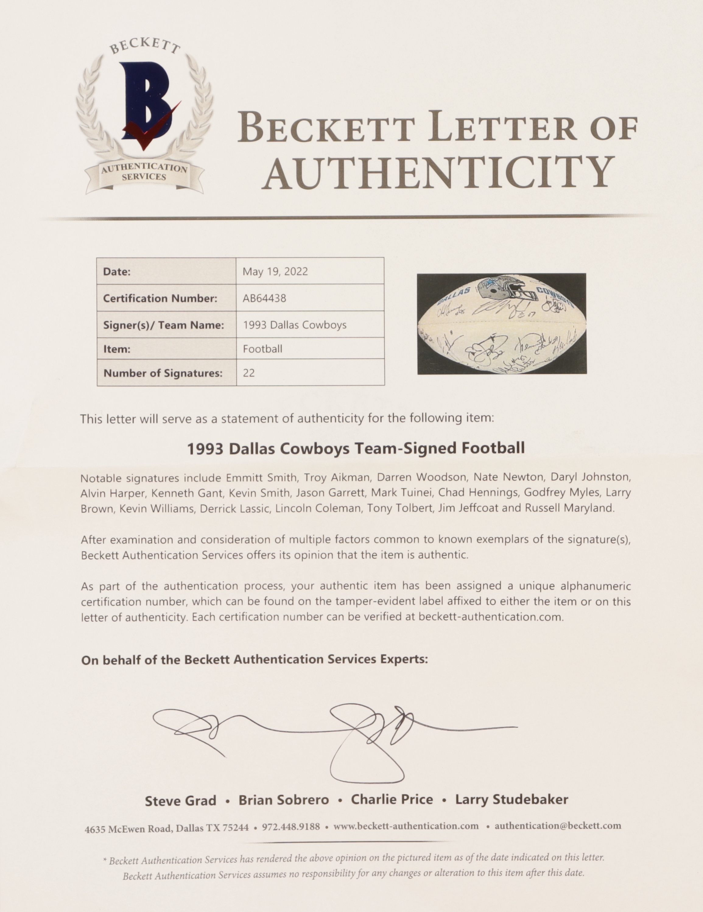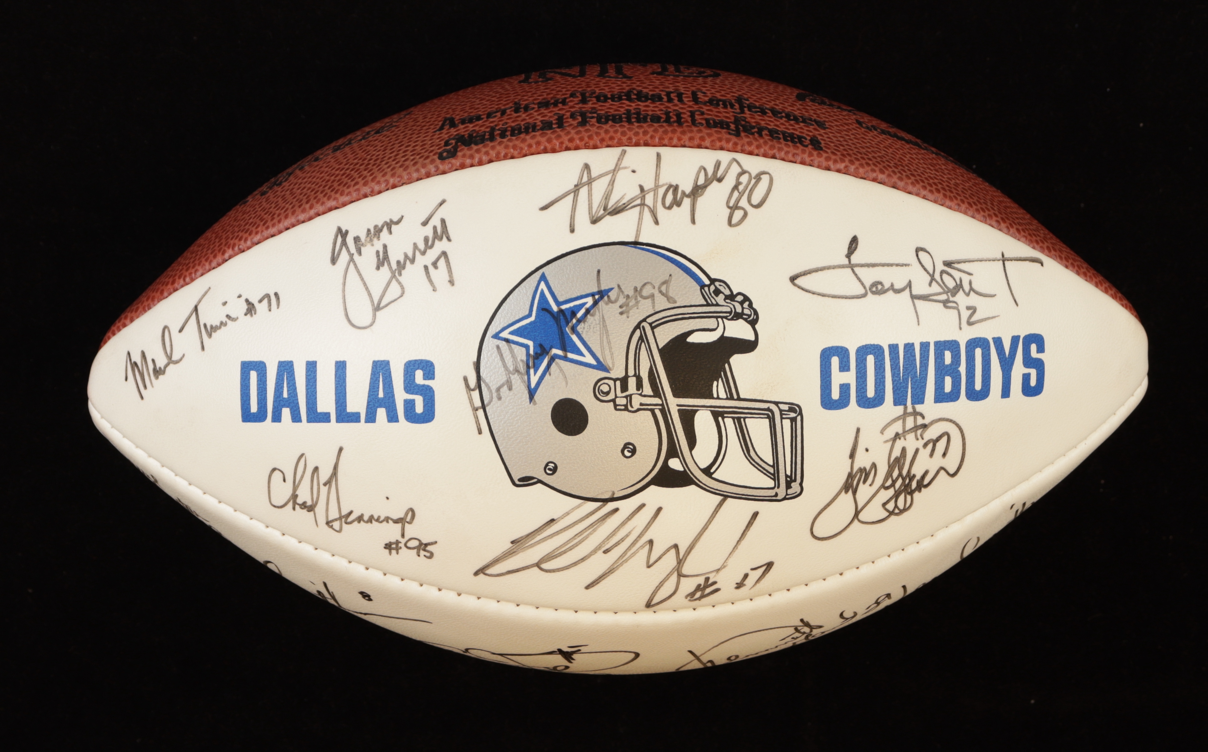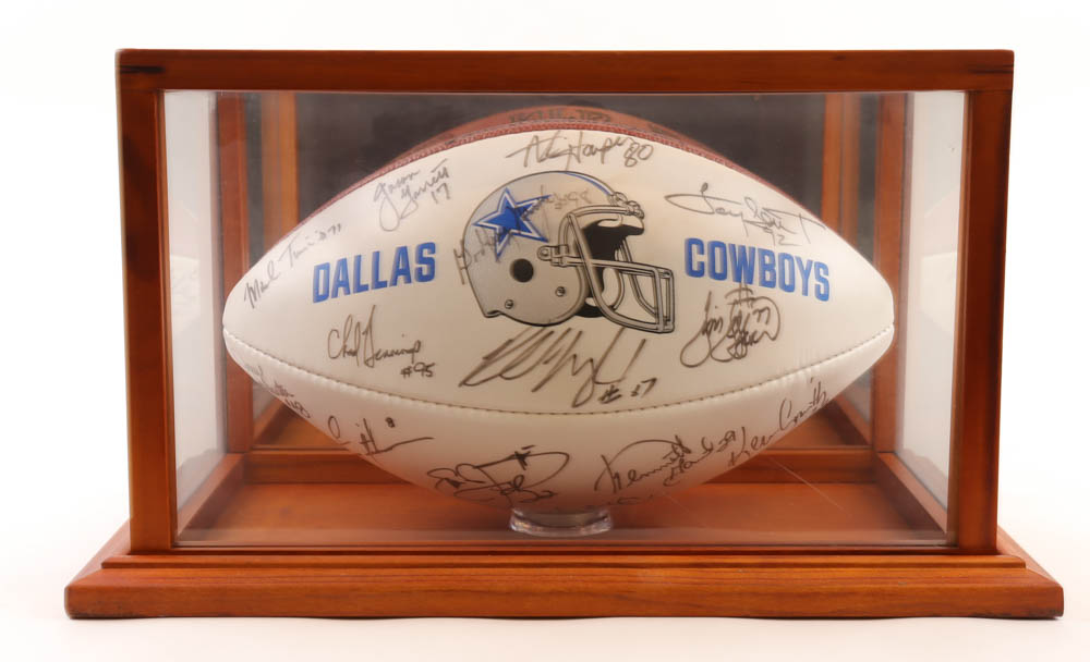 Dallas Cowboys Wilson Official NFL football. Hand-signed by Emmitt Smith, Troy Aikman, Darren Woodson, Nate Newton, Daryl Johnston, Alvin Harper, Kenneth Gant, Kevin Smith, Jason Garrett, Mark Tuinei, Chad Hennings, Godfrey Myles, Larry Brown, Kevin Williams, Derrick Lassic, Lincoln Coleman, Tony Tolbert, Jim Jeffcoat and Russell Maryland. Glass display case is included as shown.