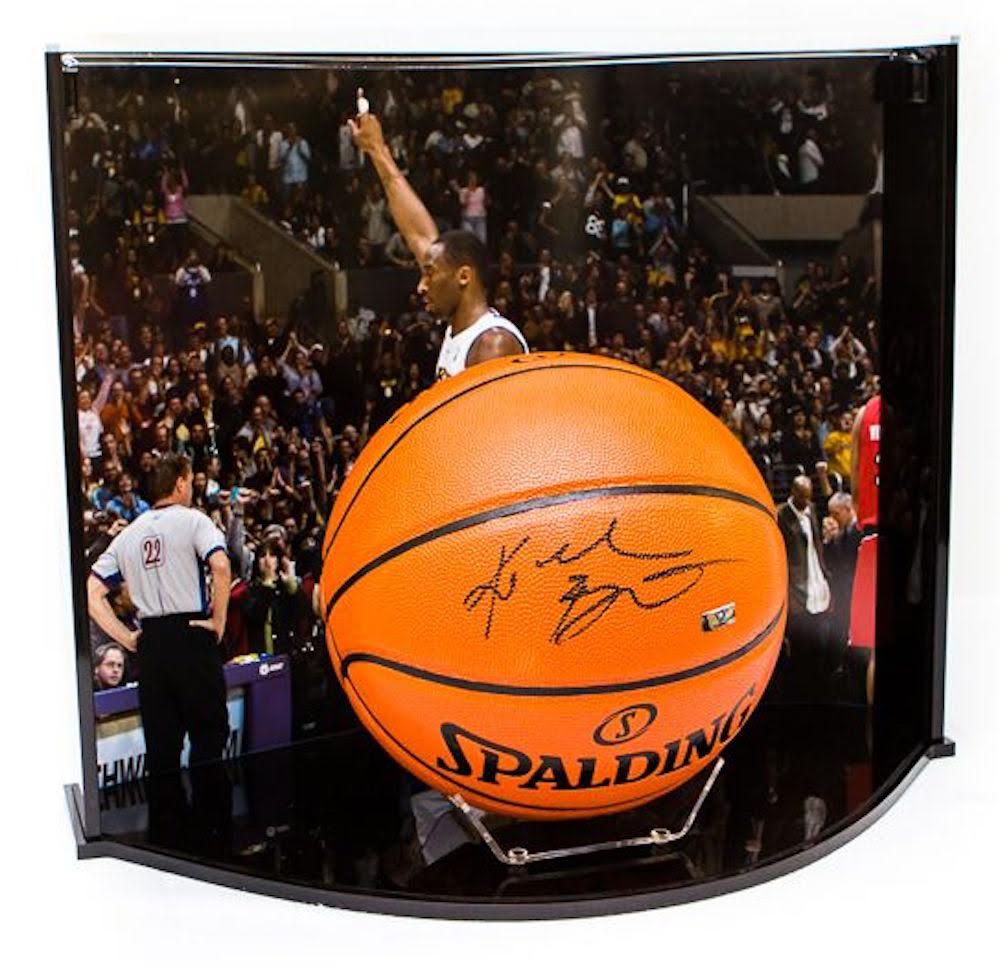 Overall, the display case has an approximate size of 19.875" wide x 16" high x 12.25" deep and weighs 9 lbs. Carefully packed inside a protective box for shipment are the display's base, two clear acrylic covers, lid, two side panels, brace, 4 screws, and a "game item" holder. This custom designed basketball and case is a must have for any sports fan. Please note, some minor assembly is required. This replica Spalding basketball which was personally autographed by Kobe Bryant includes a Panini Authentic certificate of authenticity with a unique hologram number that corresponds to the hologram on the actual ball. These holograms protect the integrity of the product and serve to guarantee the authenticity of the signature it bears.