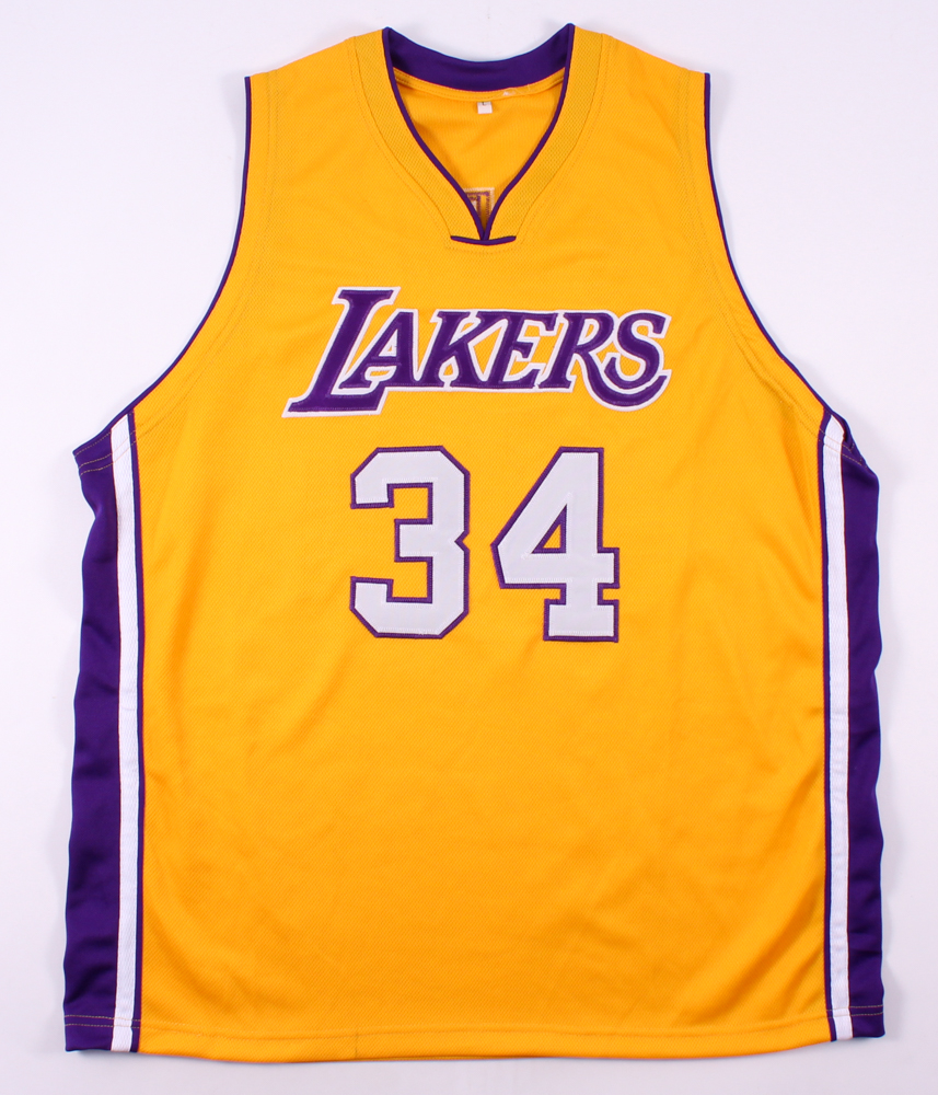 Custom on-court style jersey. Everything sewn on, size L. Hand-signed in black felt-tip pen by Shaquille O'Neal (Lakers, HOF). Please note, there is a small stain on the bottom on the jersey. Please see photos for details.