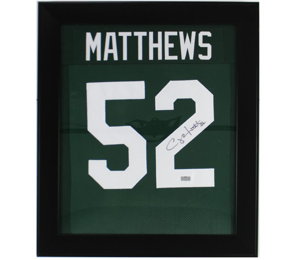 Custom framed jersey display measures 29" x 25" in size and features a jersey that has been hand-signed by Clay Matthews.
