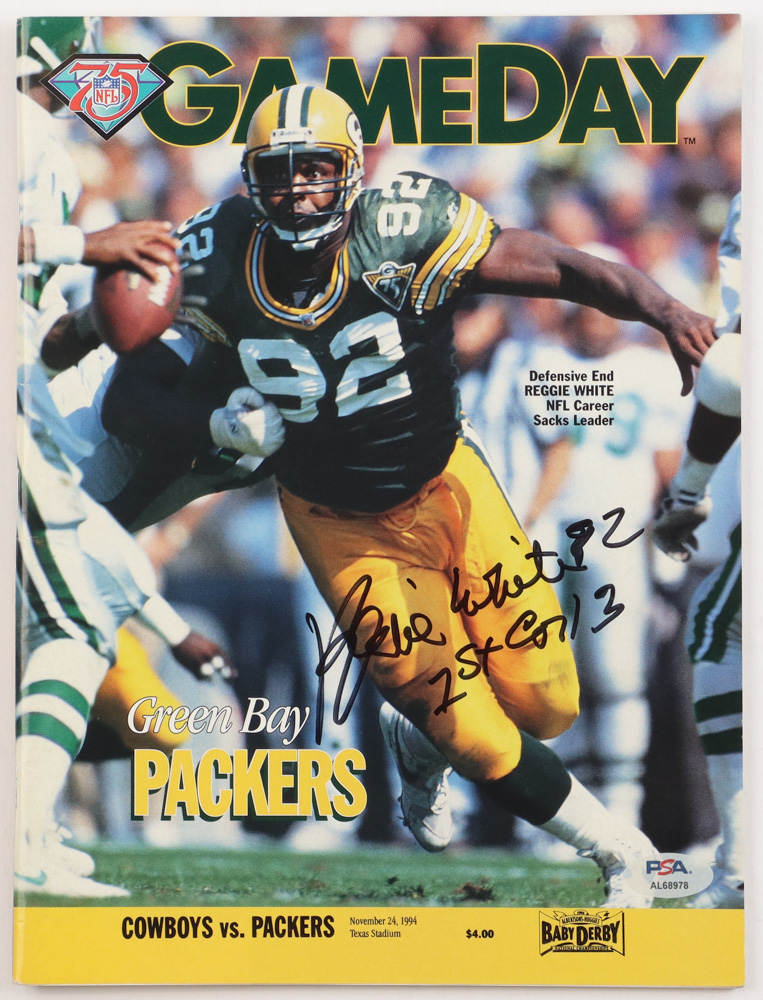 1994 Green Bay Packers game program has been hand-signed on the cover by Reggie White (D. 2004, Green Bay Packers, HOF).
