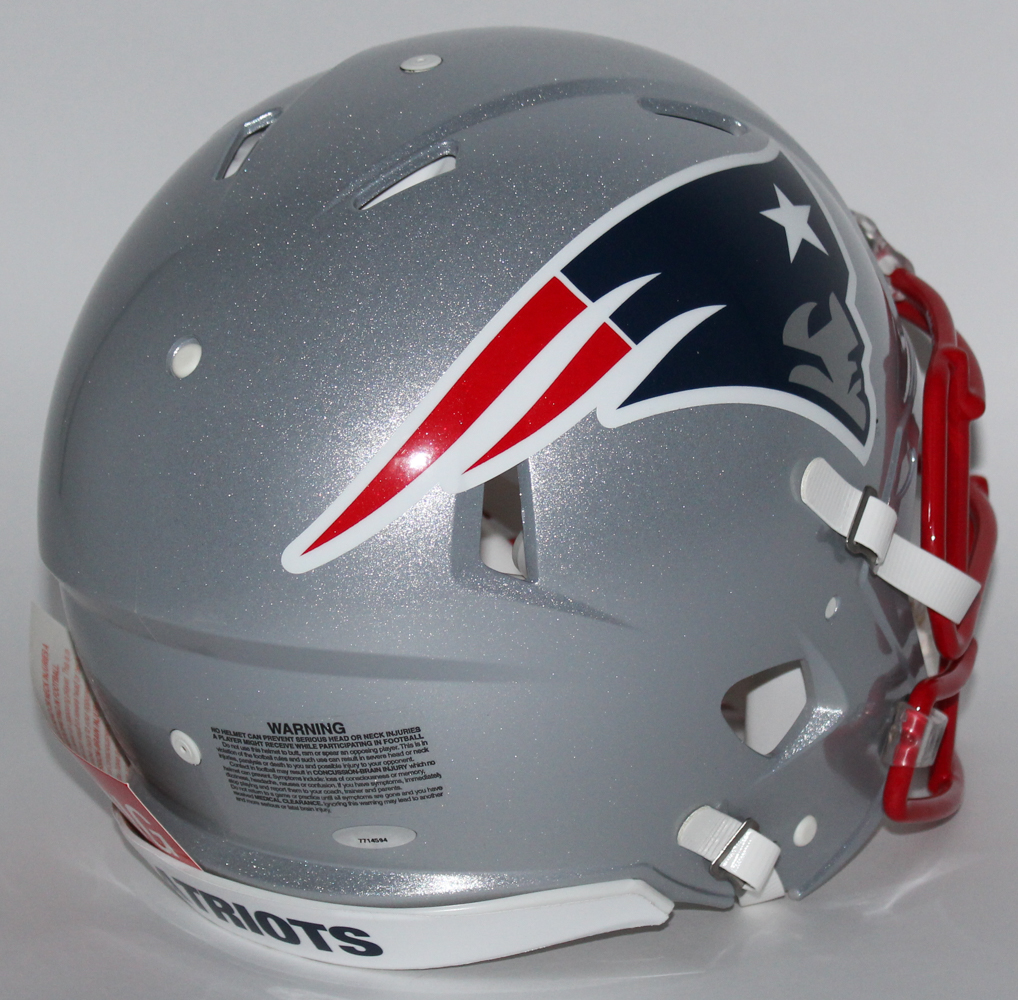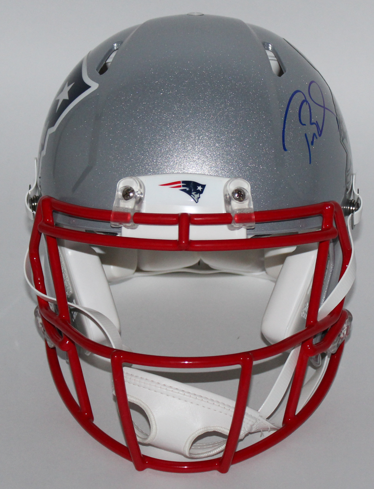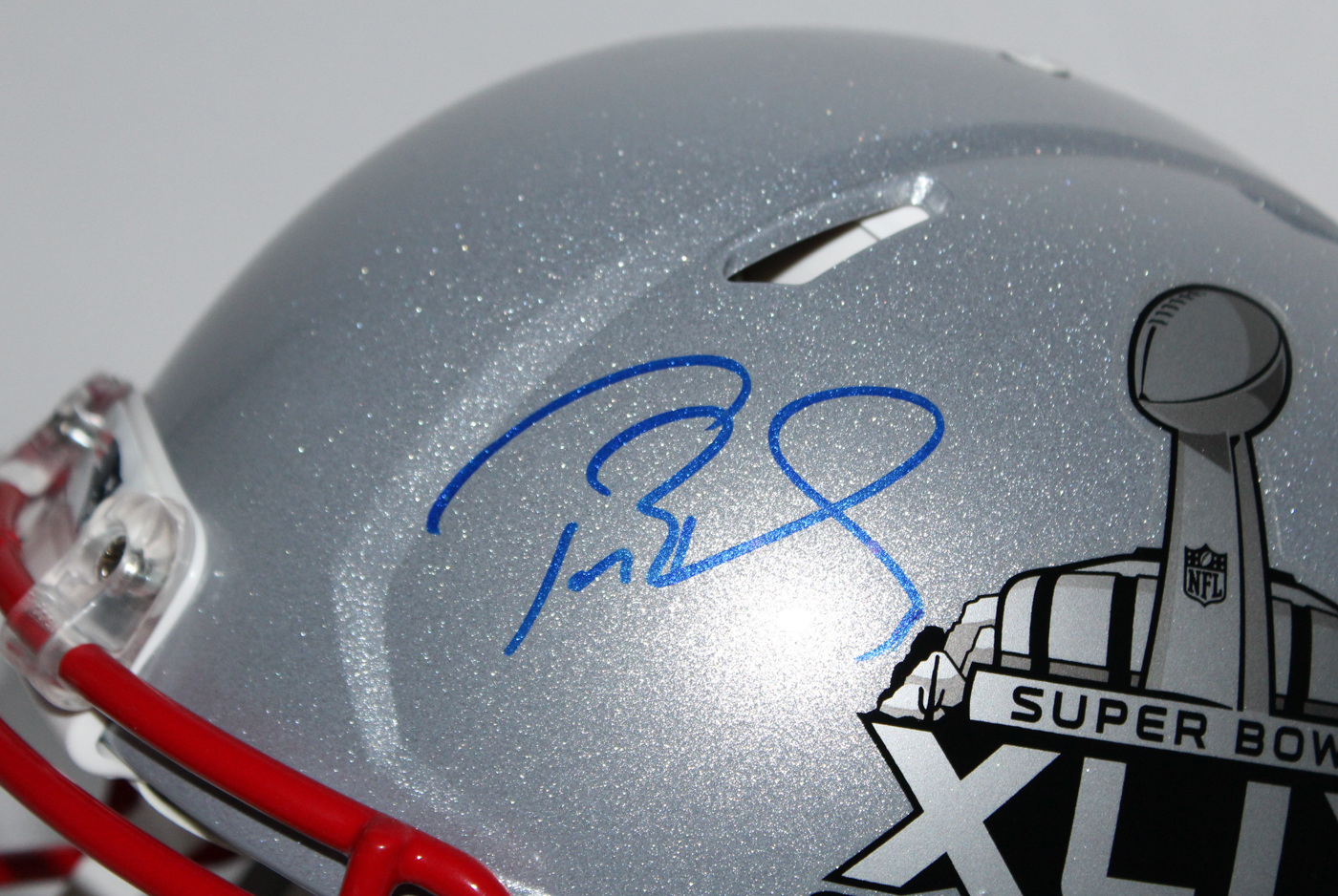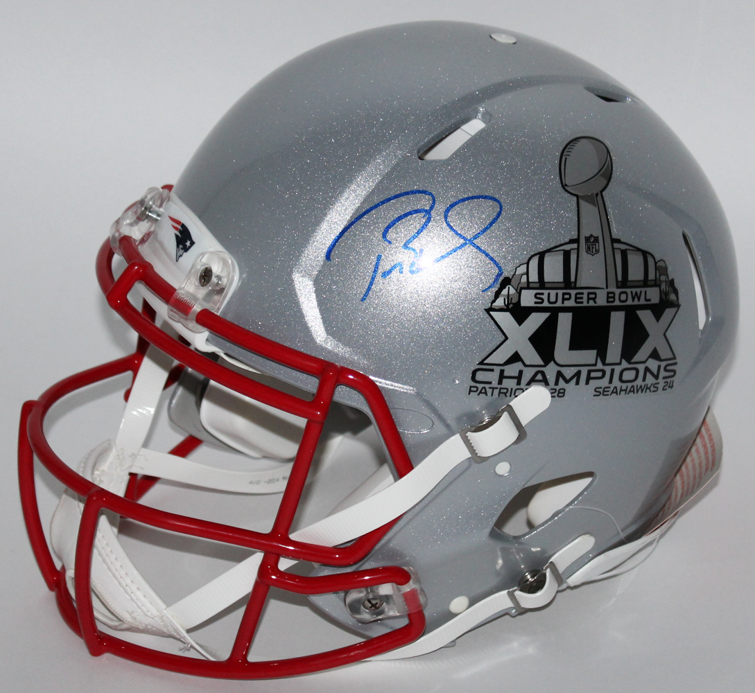 New England Patriots "Super Bowl XLIX" Speed Full-size authentic proline helmet. Hand-signed in blue felt-tip pen by Tom Brady (Patriots).