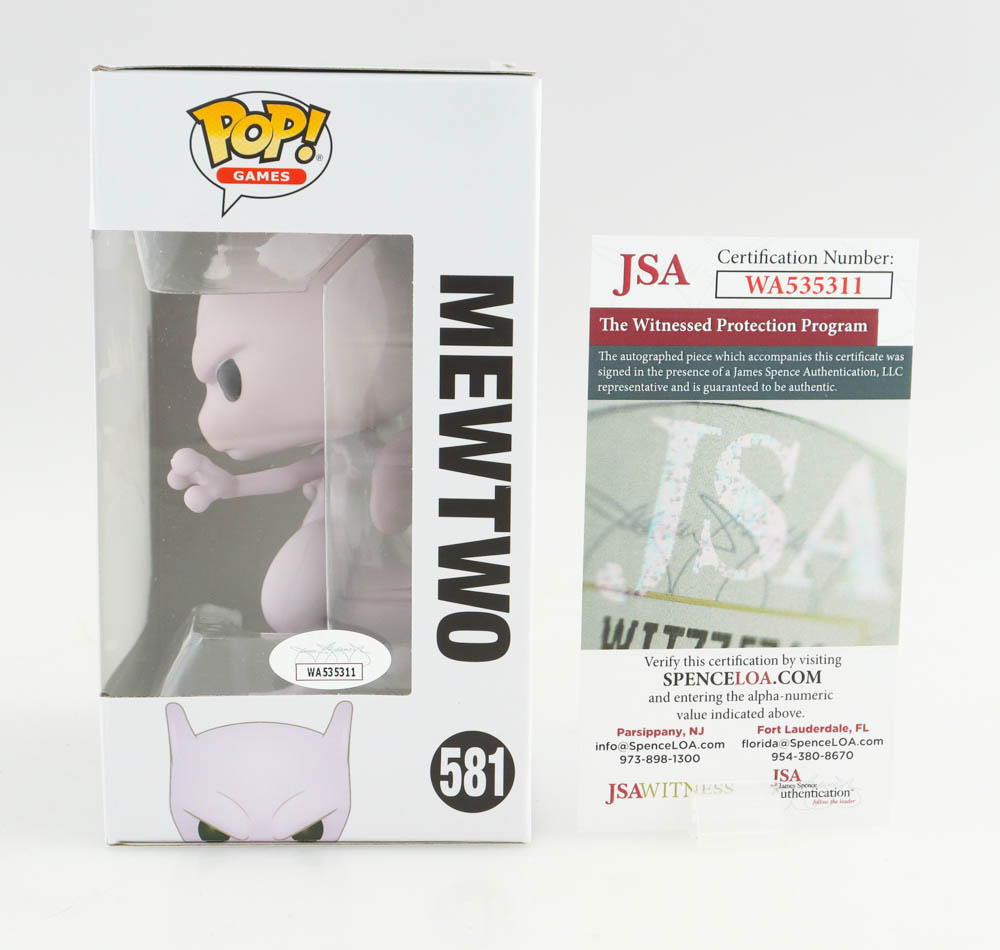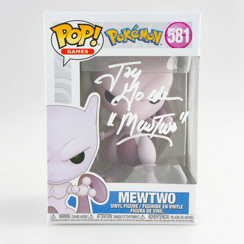 Funko Pop! vinyl figure measures approximately 4" tall. Hand-signed on the original packaging by Jay Goede (Mewtwo). Please note packaging is partially damaged.