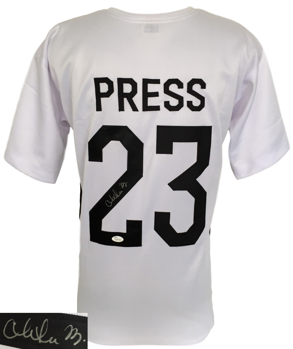 Custom on-field style jersey. Everything is sewn on, size M. Hand-signed in silver paint pen by Christen Press.