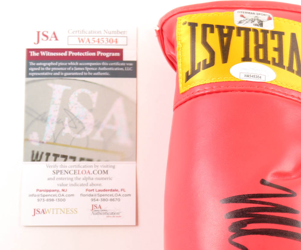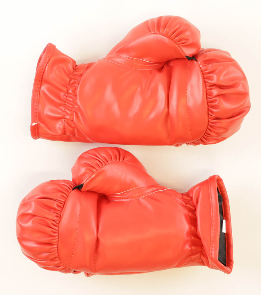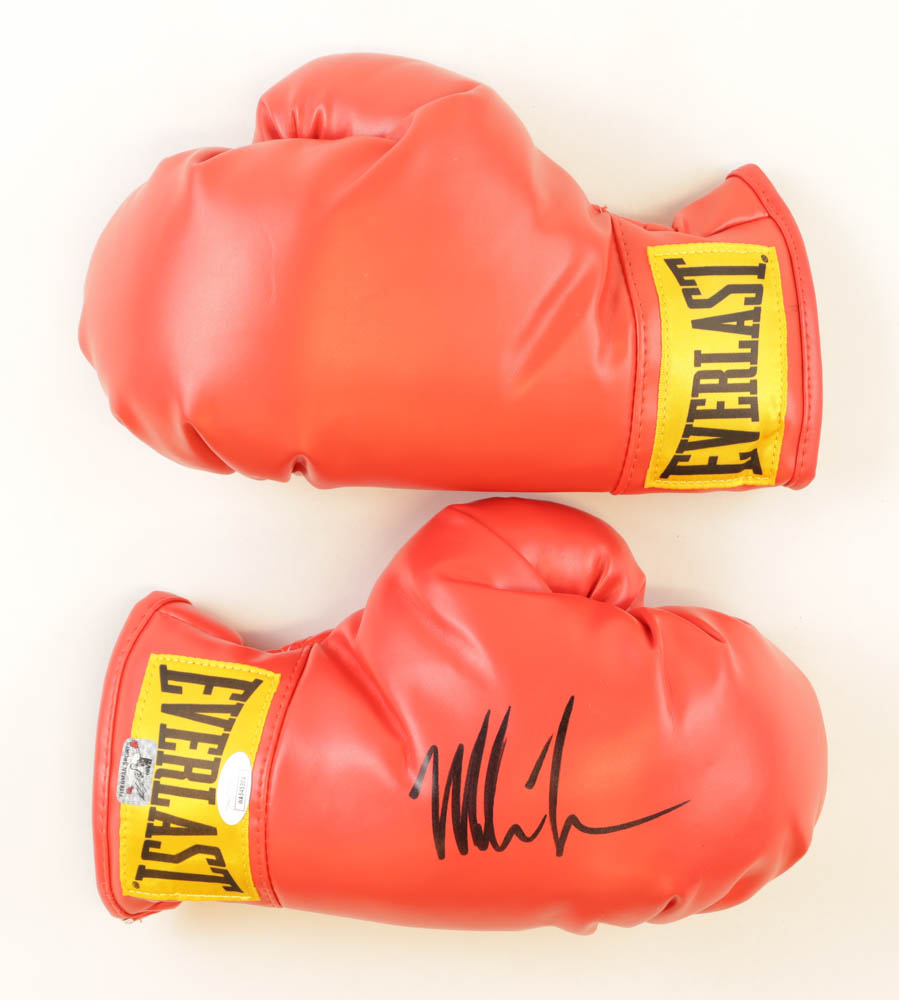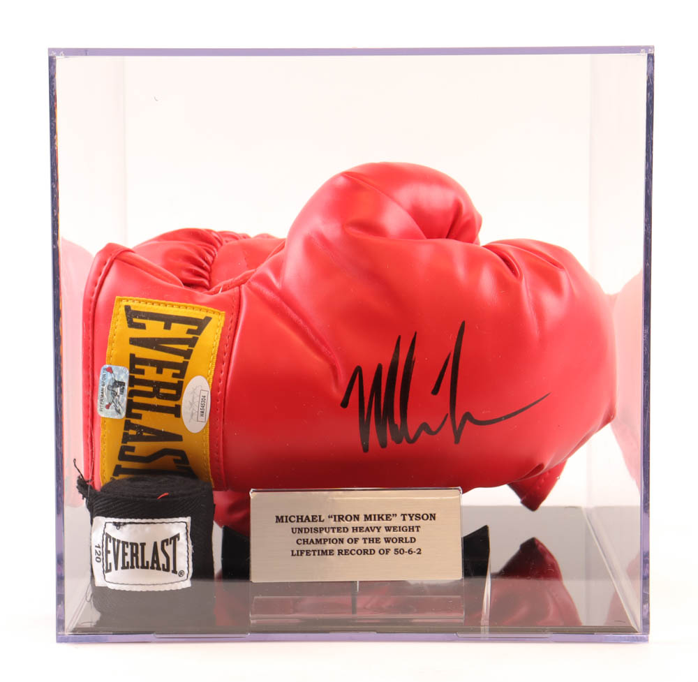 Pair of Everlast boxing gloves. Only the right glove has been hand-signed by Mike Tyson (HOF). The display case and wrist wraps are included as shown.