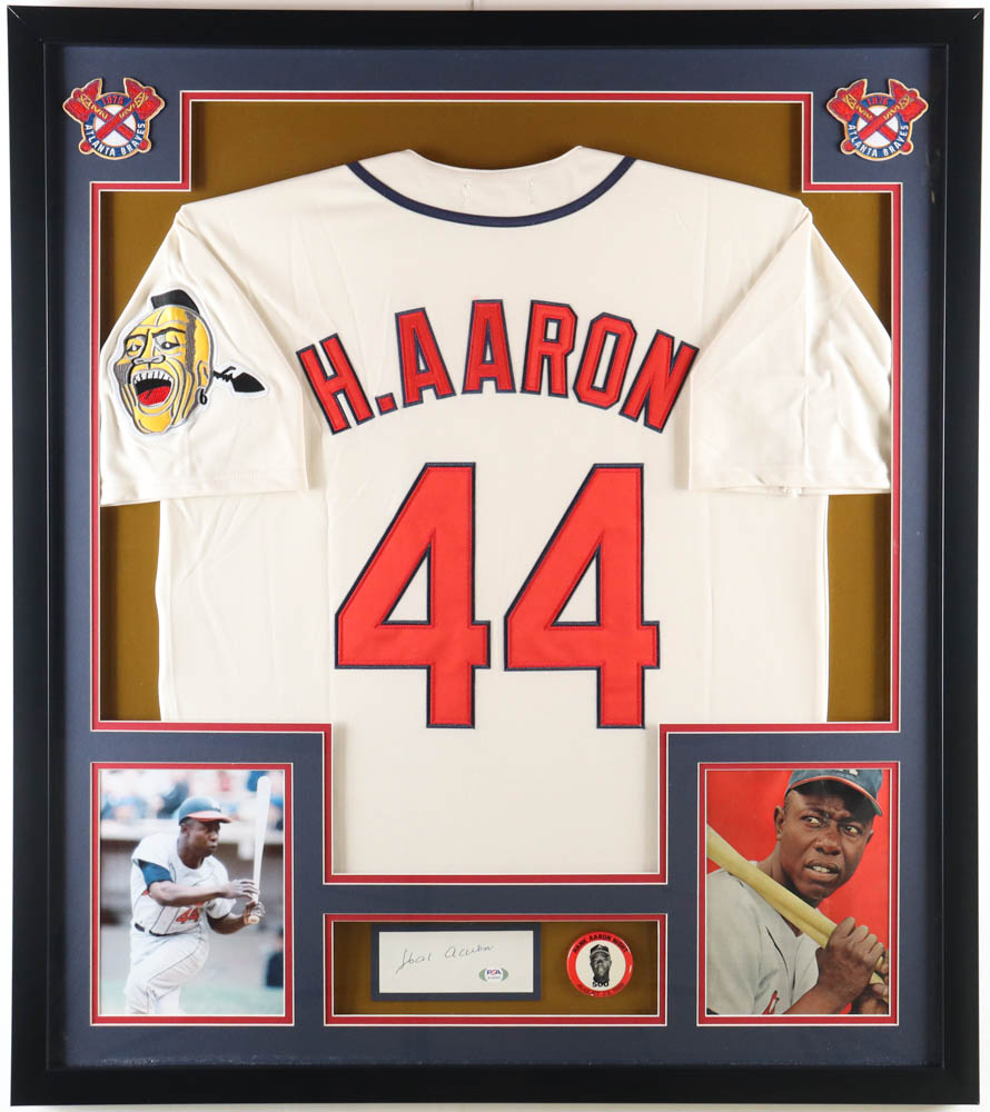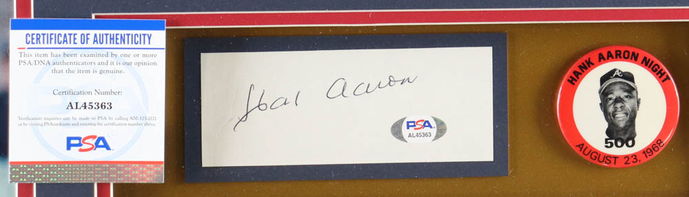 Hank Aaron Signed Braves Custom Framed Cut Display with Jersey & "Hank Aaron Night" 1968 Vintage 500 Home Run Pin (PSA)