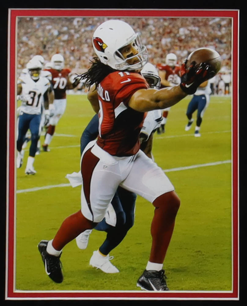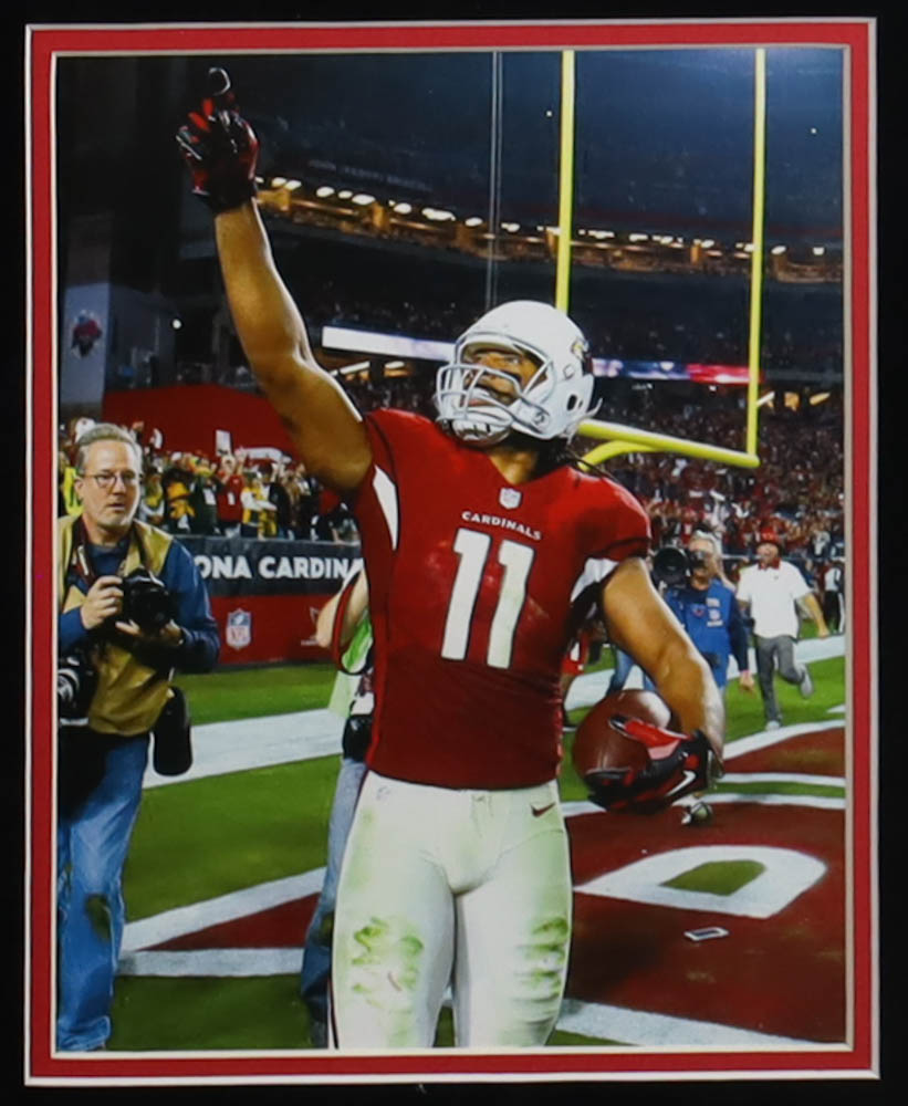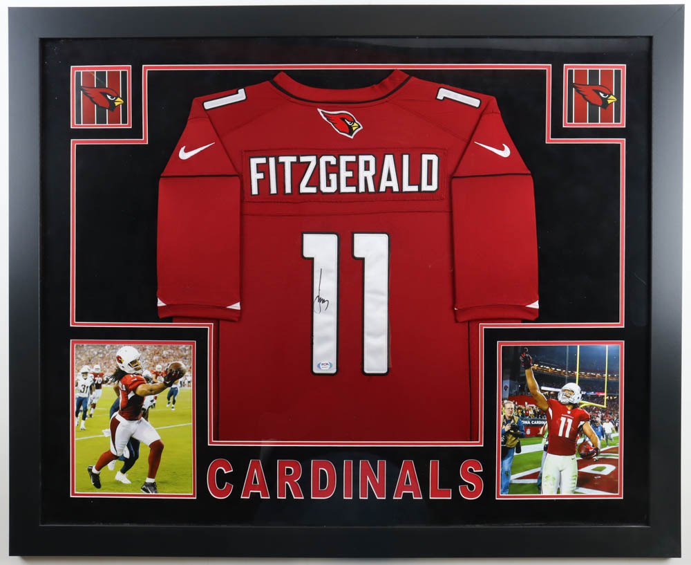 Custom frame measures approximately 35.5" x 44" in size and features a jersey hand-signed by Larry Fitzgerald. The display also includes (2) photos.