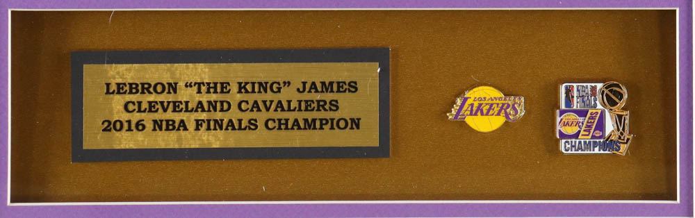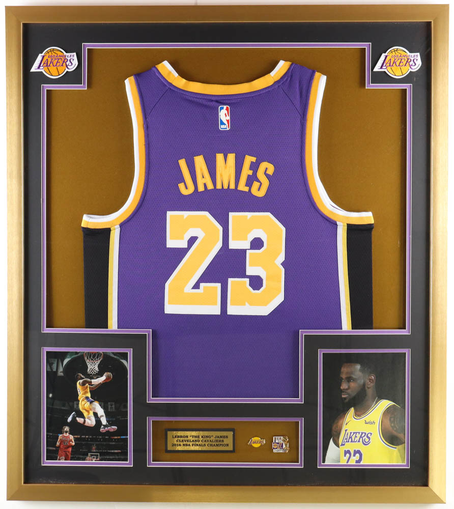 Custom framed display measures approximately 32" x 36" in size. The display includes a Lebron James (Los Angeles Lakers) custom unsigned jersey, a Lakers logo pin & a NBA Finals Championship pin as well as (2) photos of James. Please note, the display is unsigned.