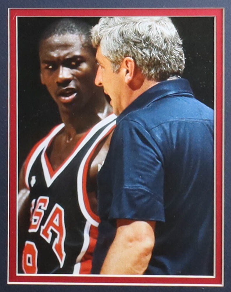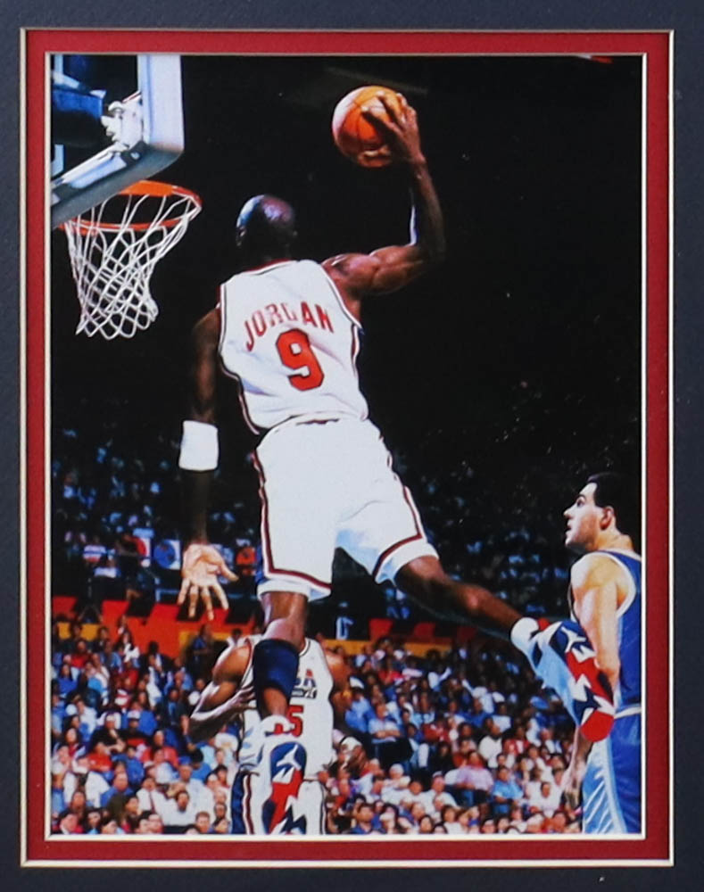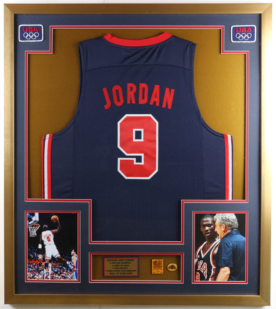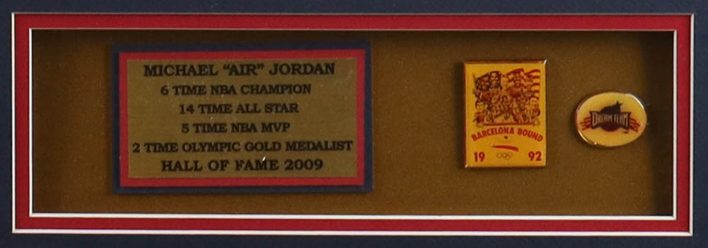 Custom frame measures 32" x 36" in size and features an unsigned Michael Jordan jersey (Chicago Bulls, HOF), (2) Dream Team USA Basketball Olympic pins as well as (2) Team USA Olympic patches and (2) photos.