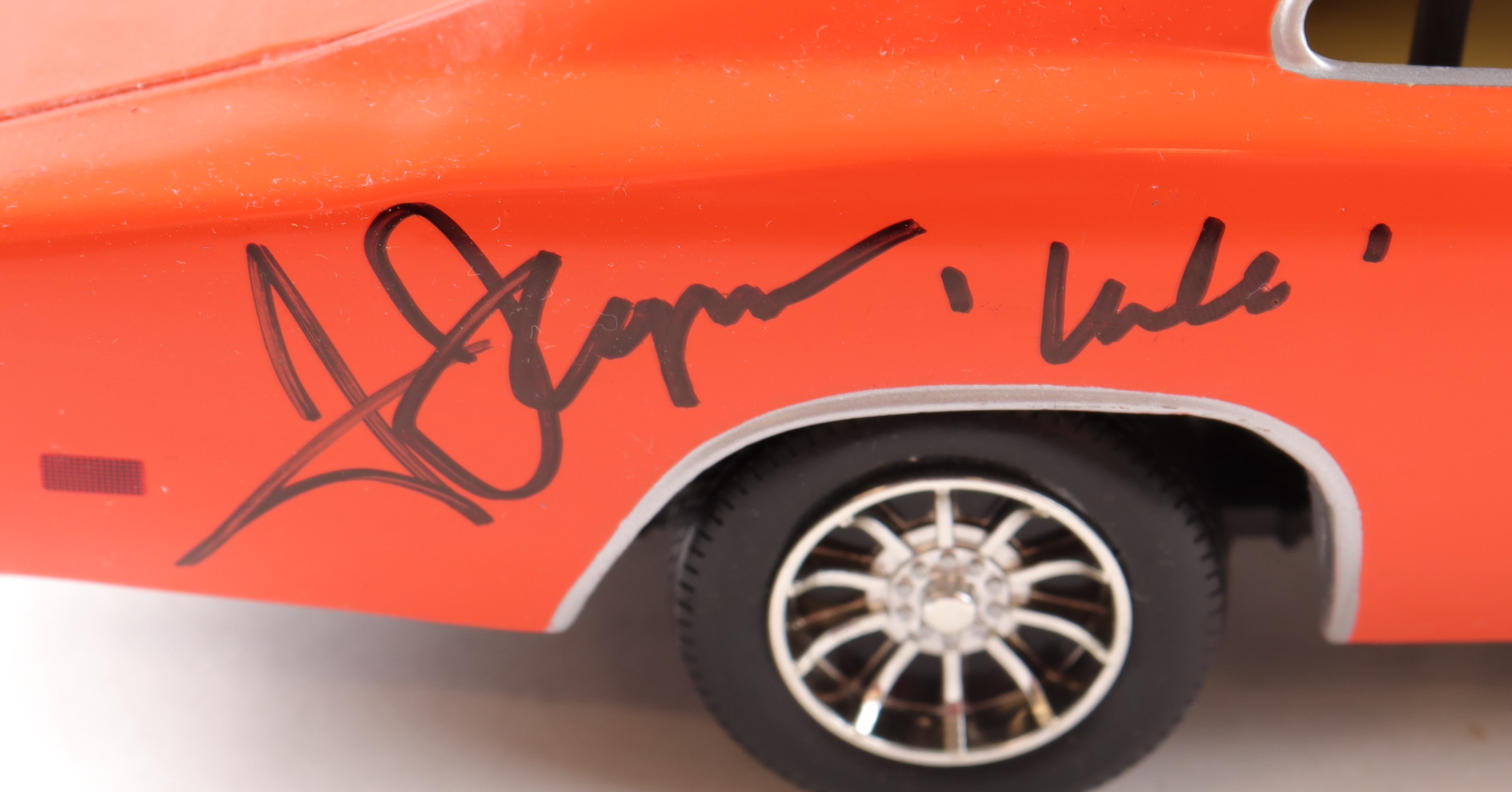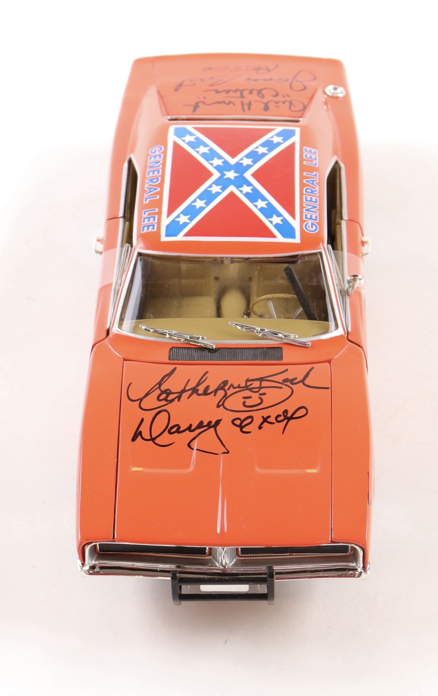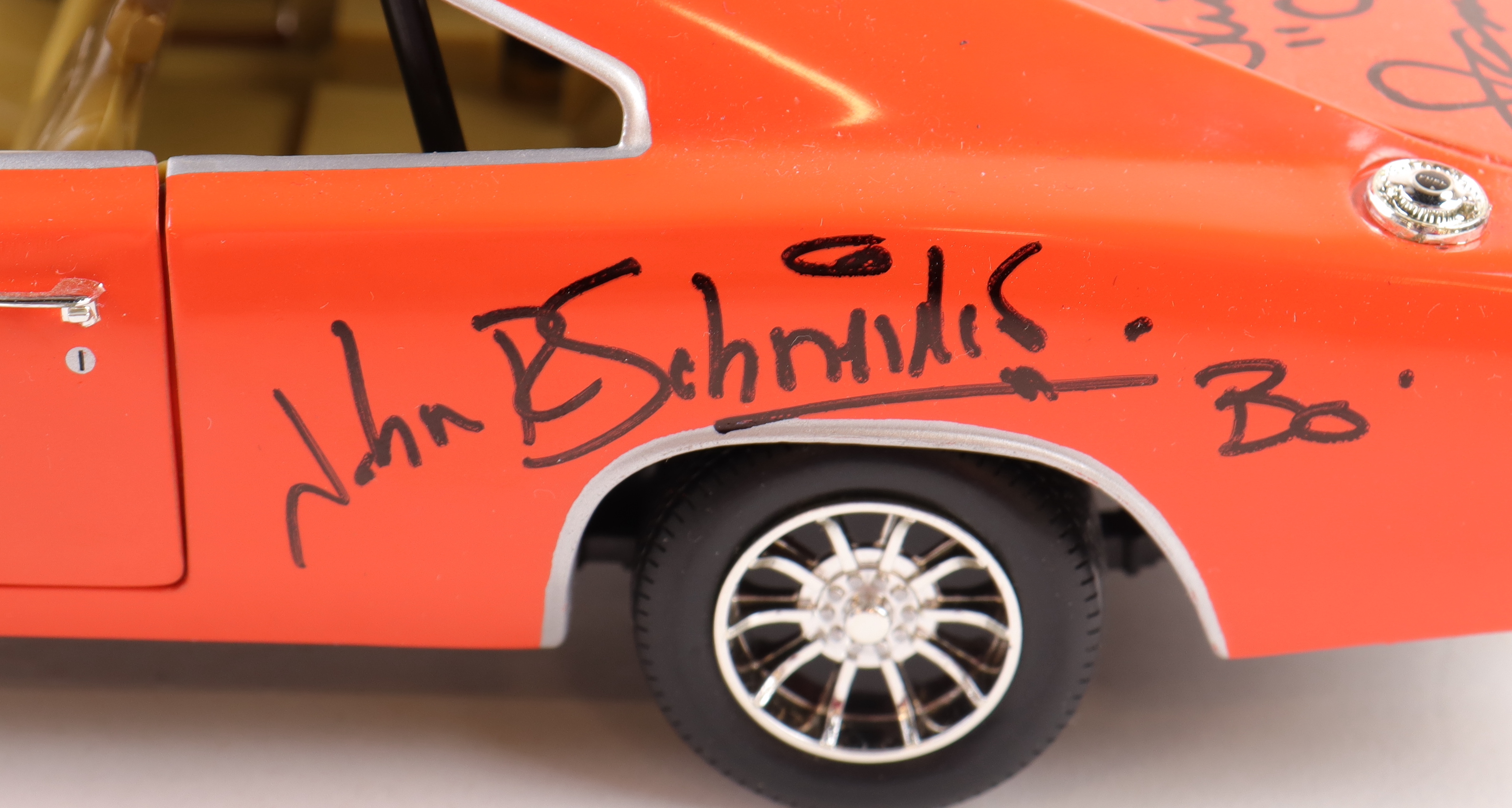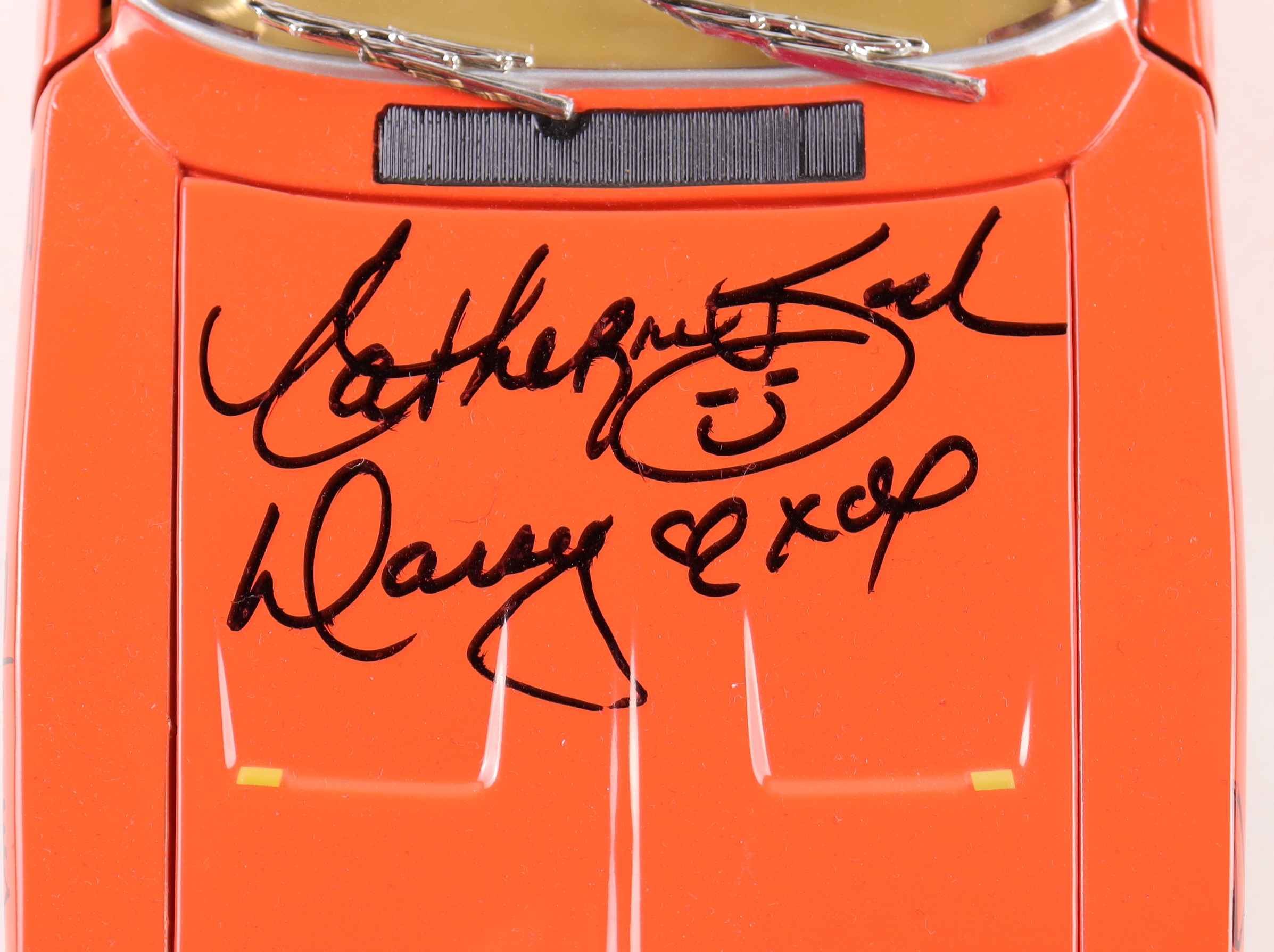 Die-cast car has been hand-signed and inscribed by (3) cast members including Catherine Bach (Daisy), John Schneider (Bo), and Tom Wopat (Luke).