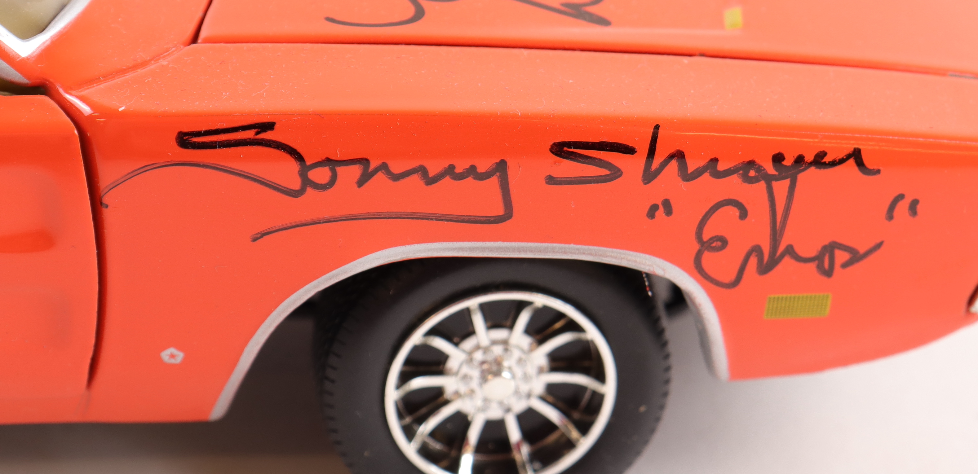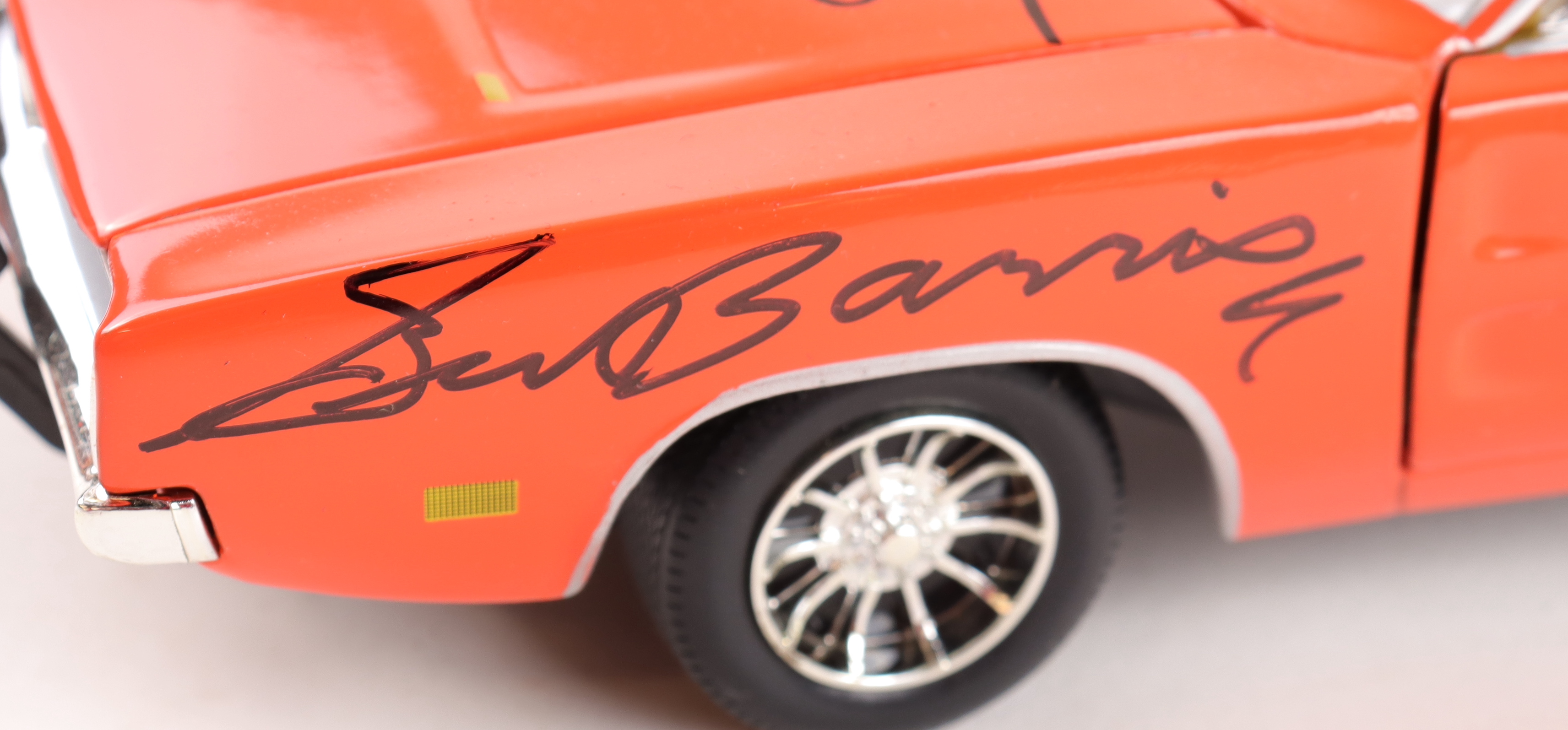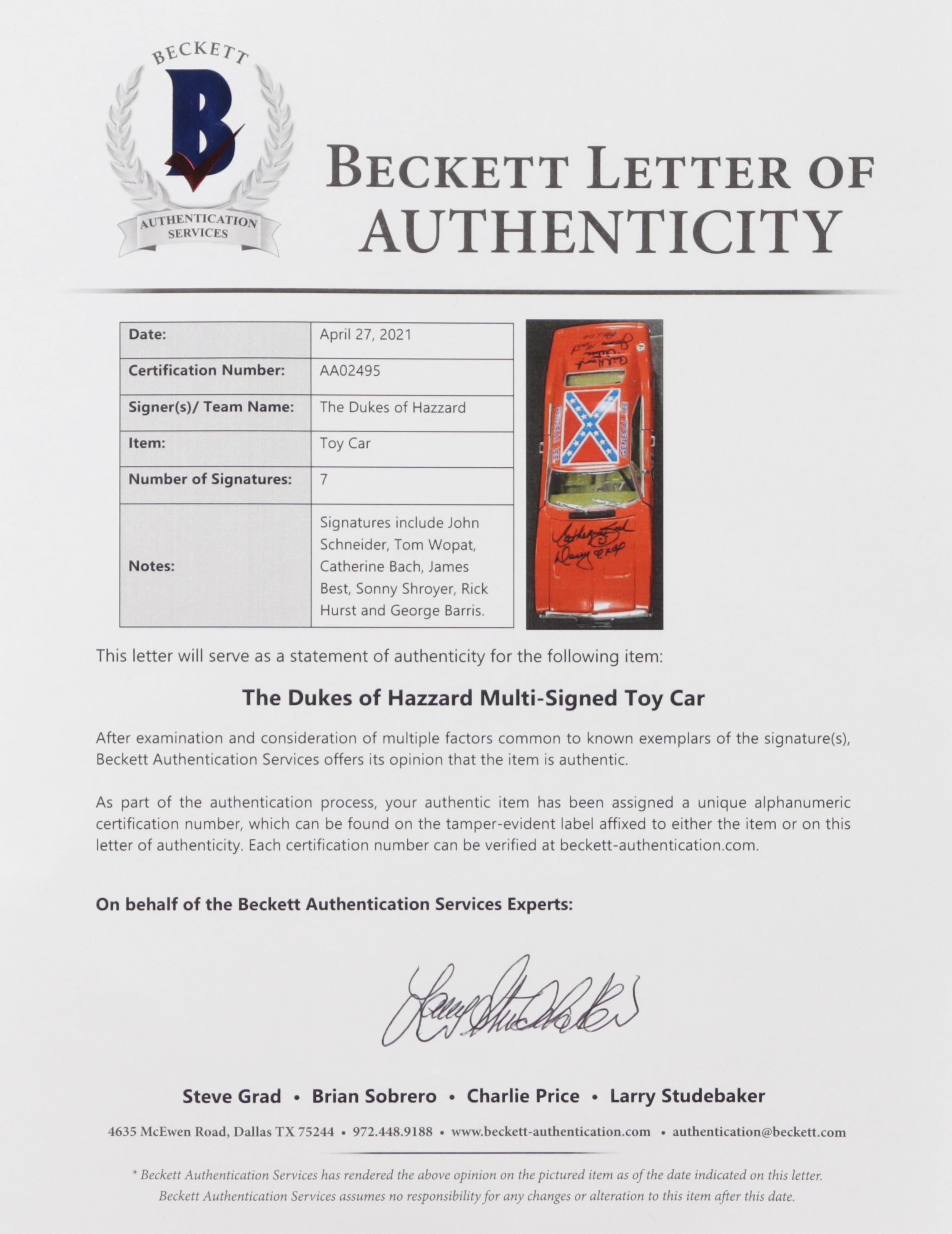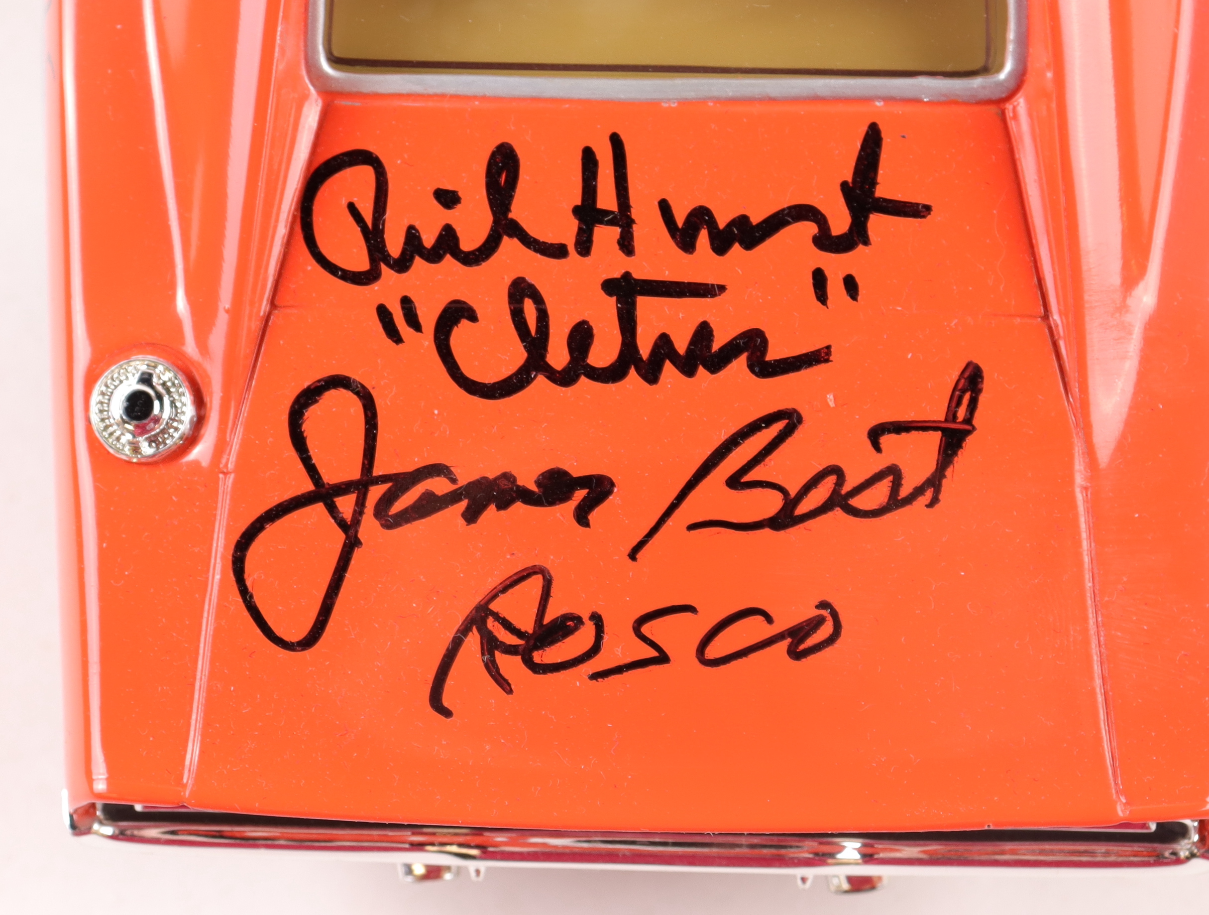 Die-cast car has been hand-signed and inscribed by (3) cast members including Catherine Bach (Daisy), John Schneider (Bo), and Tom Wopat (Luke).
