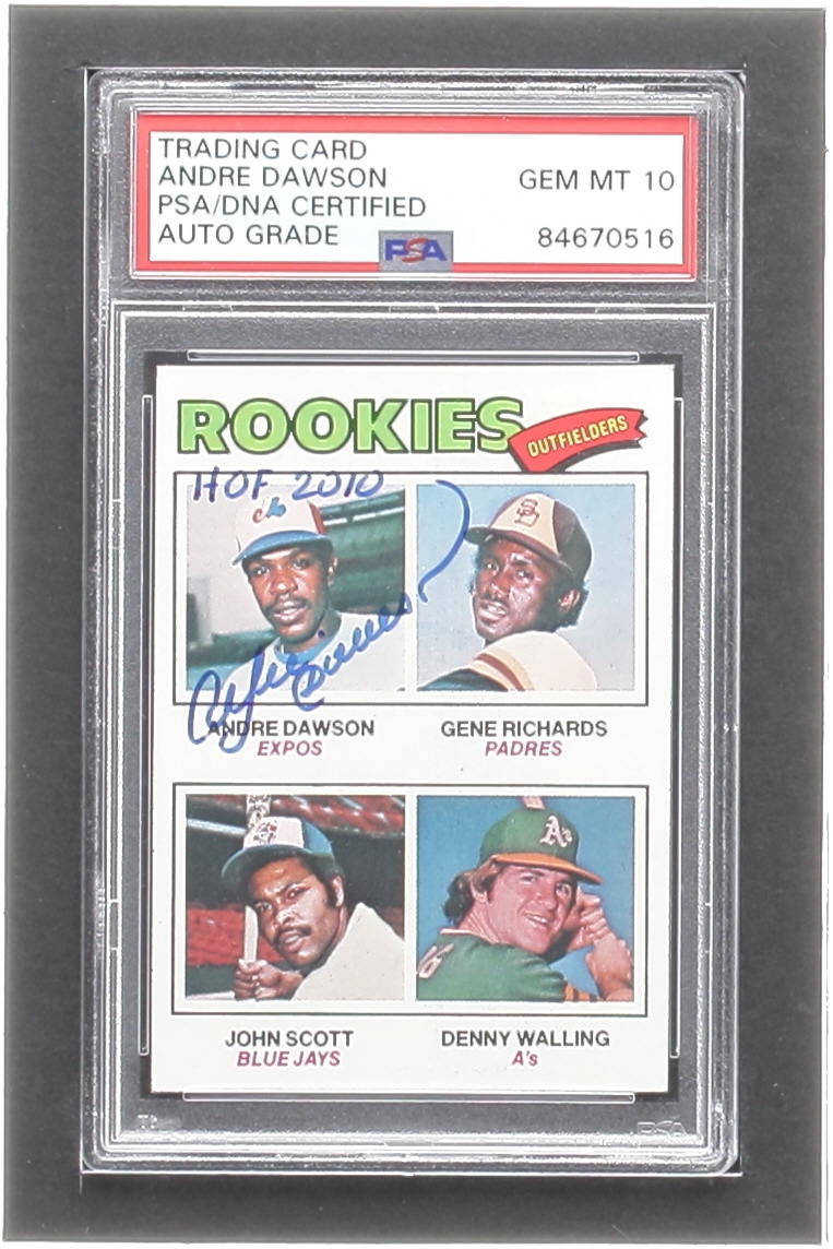 Andre Dawson Signed 1977 Topps #473 Rookie Outfielders / Andre Dawson RC / Gene Richards RC / John Scott / Denny Walling RC Inscribed "HOF 2010" (PSA)