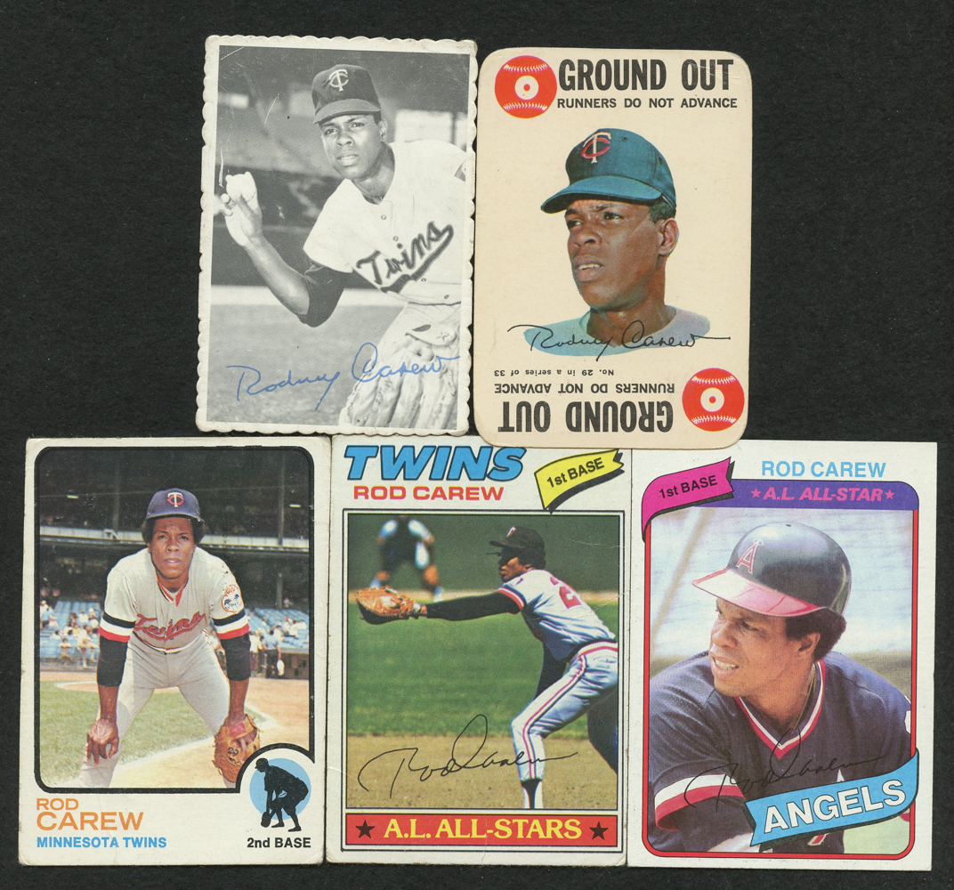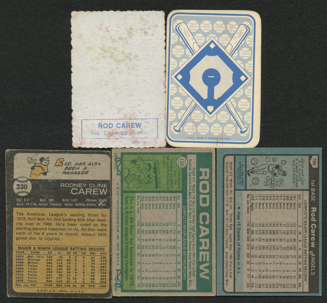 Lot of (5) Rod Carew Baseball Cards with 1973 Topps #330, 1977 Topps #120, 1980 Topps #700 DP