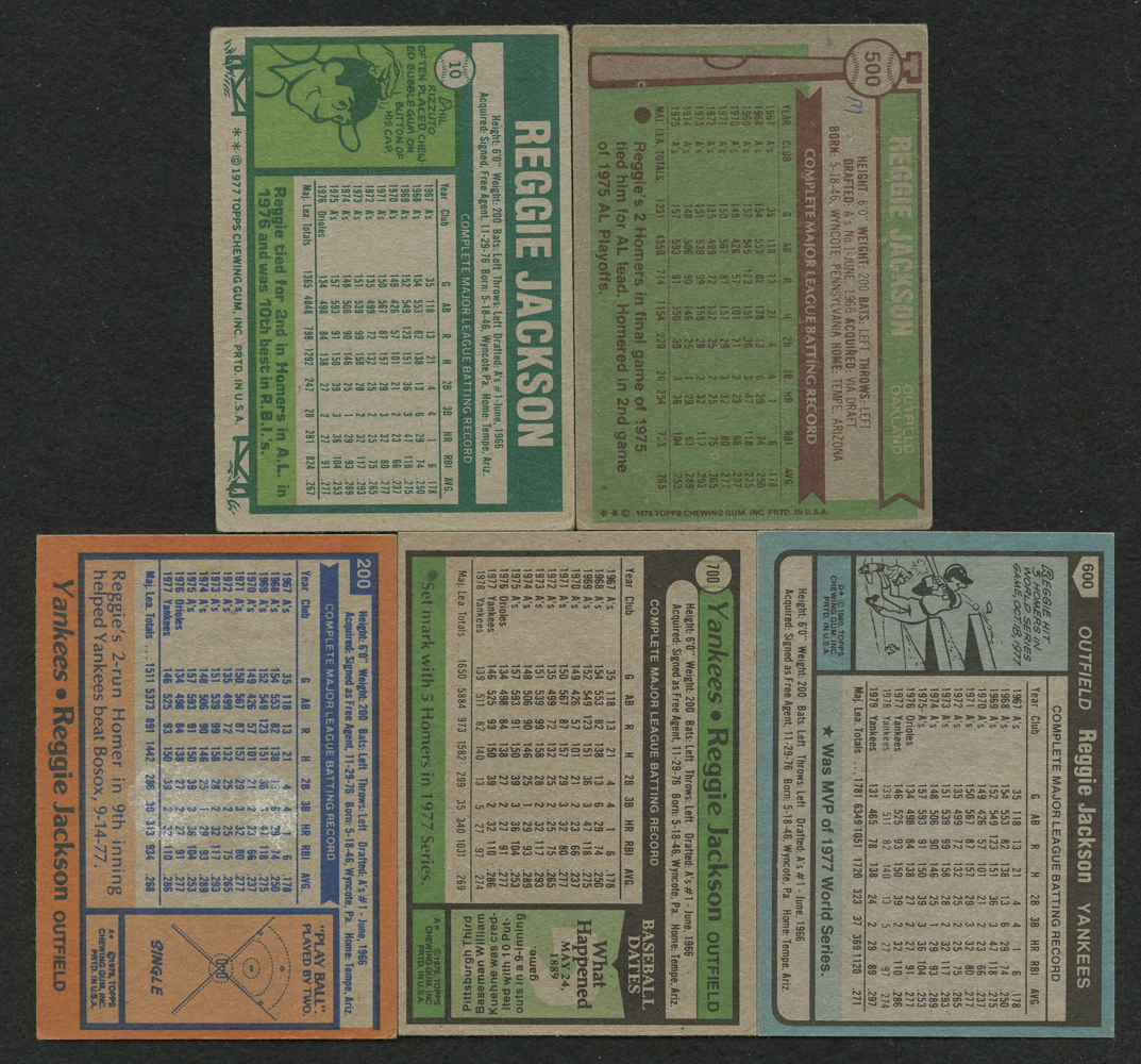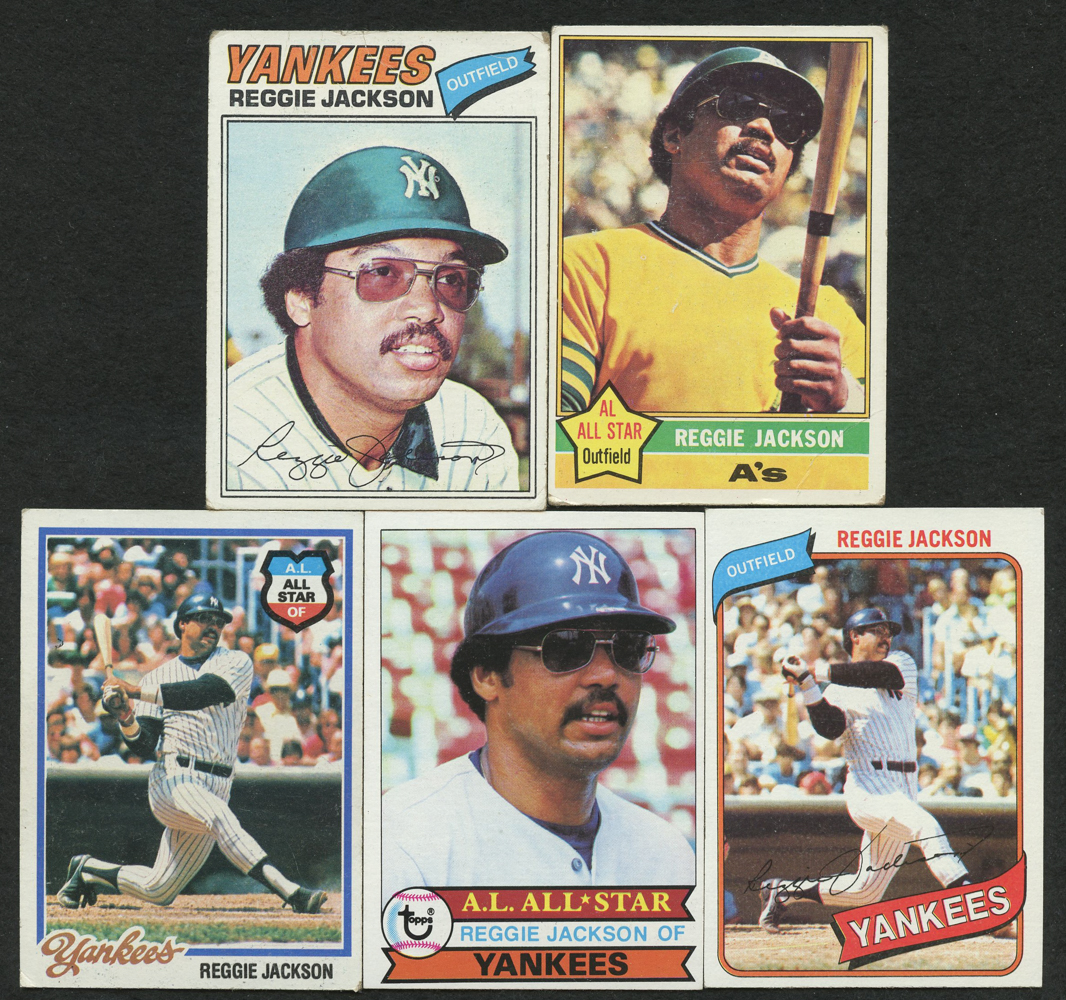 Lot of (5) Reggie Jackson Topps Baseball Cards with 1976 Topps #500, 1977 Topps #10, 1980 Topps #600