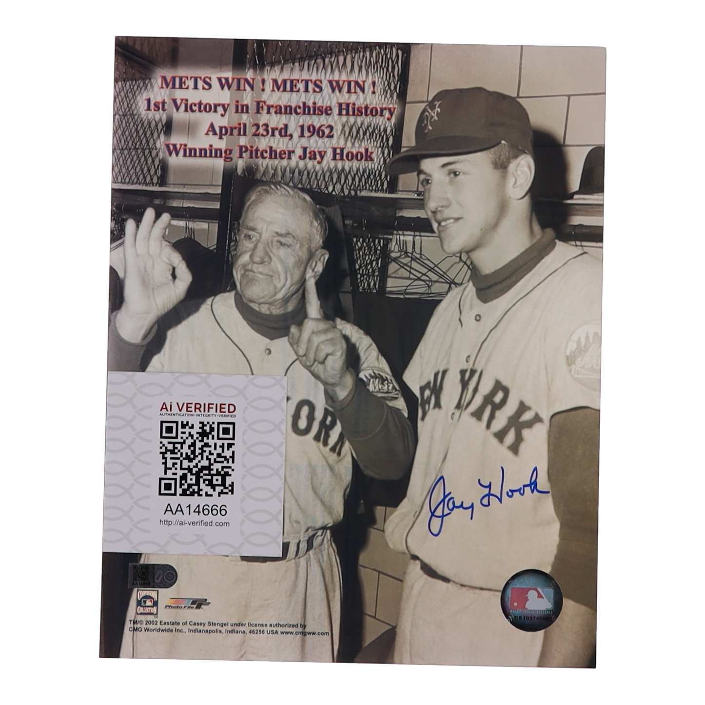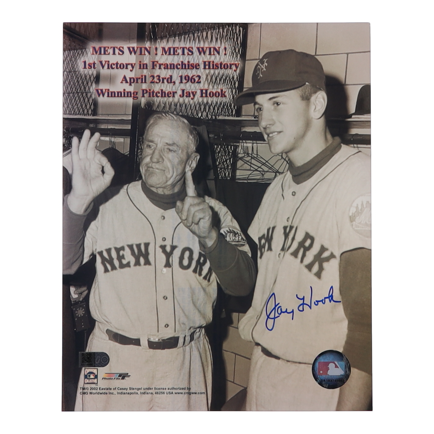 Photo measures 8" x 10" in size and has been hand-signed by Jay Hook (New York Mets).