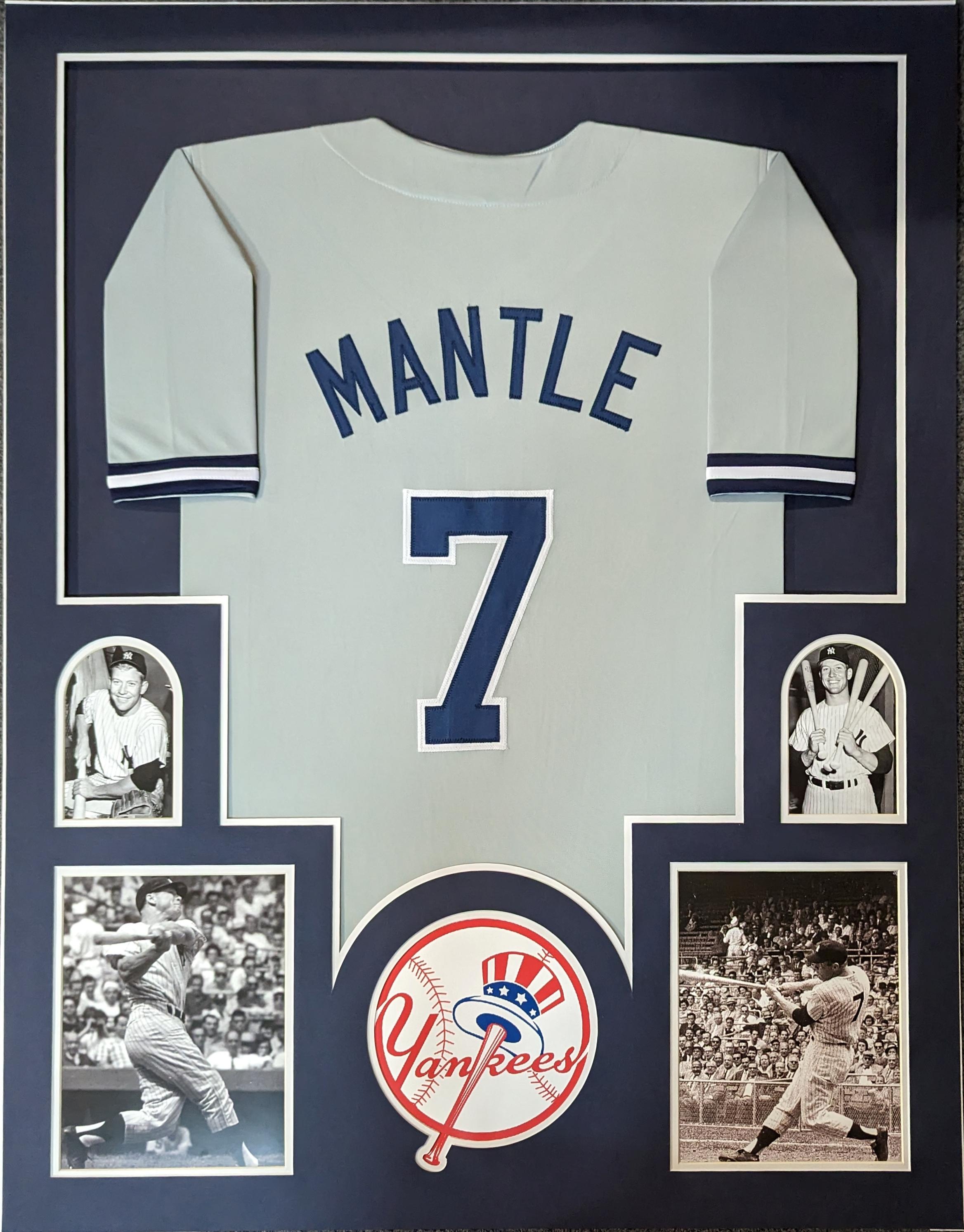 Custom framed jersey display measures 34" x 42" in size and features a Mickey Mantle jersey. Please note, the jersey is unsigned.
