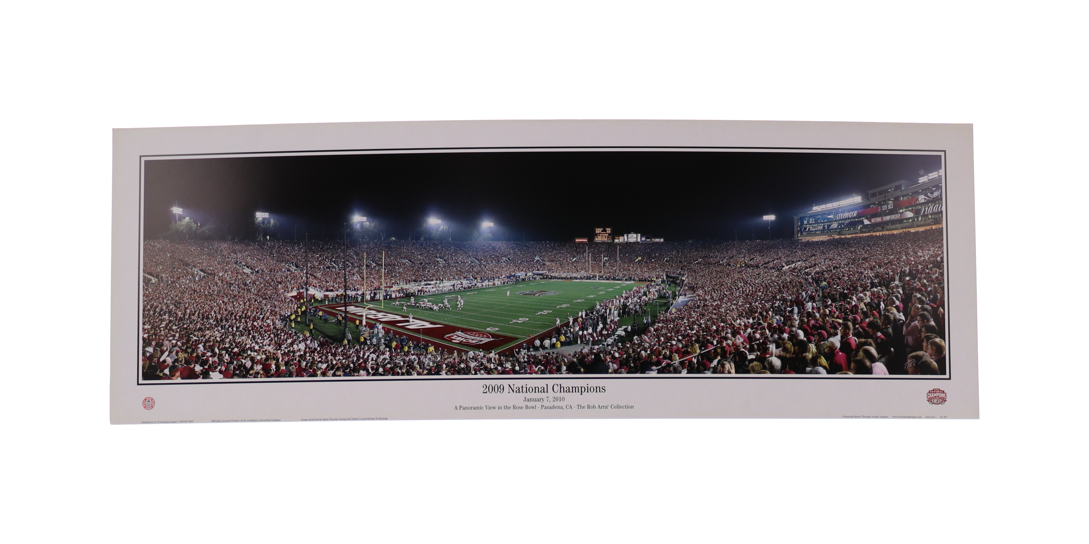 Photo measures approximately 13.5" x 39" in size and features a photo of January 7, 2010 National Champions at The Rose Bowl Stadium. Please note, that the display is unsigned.