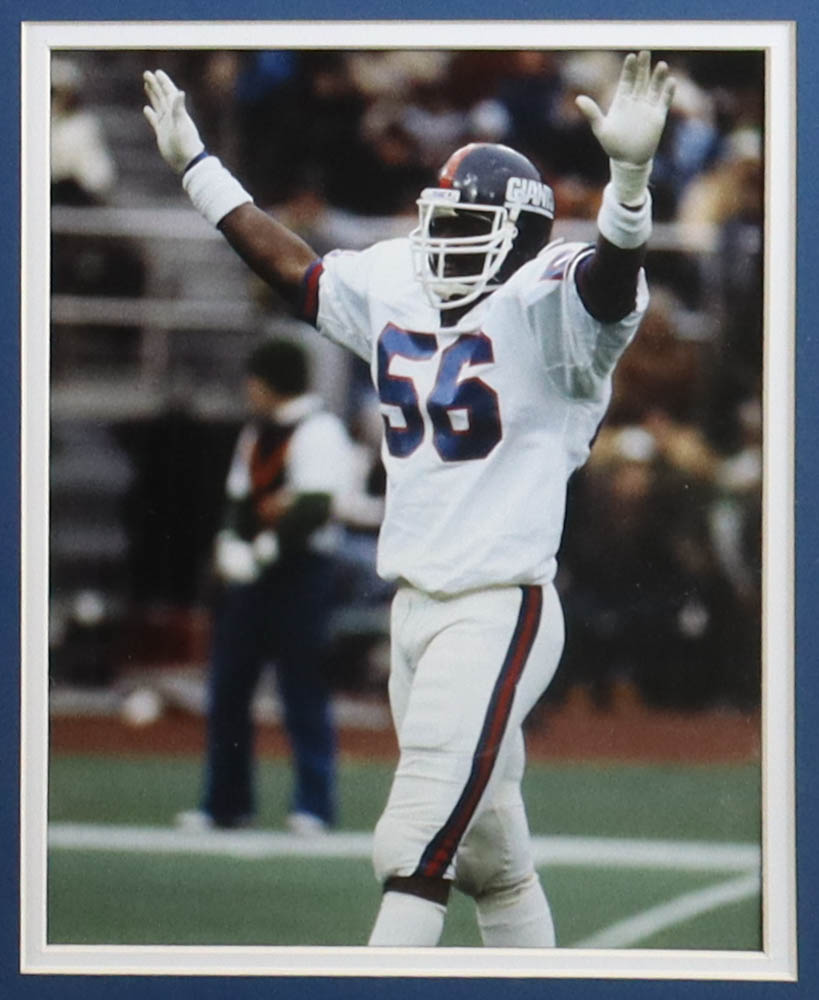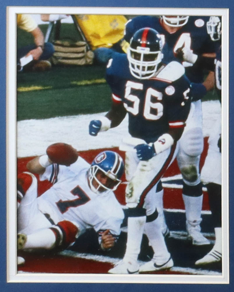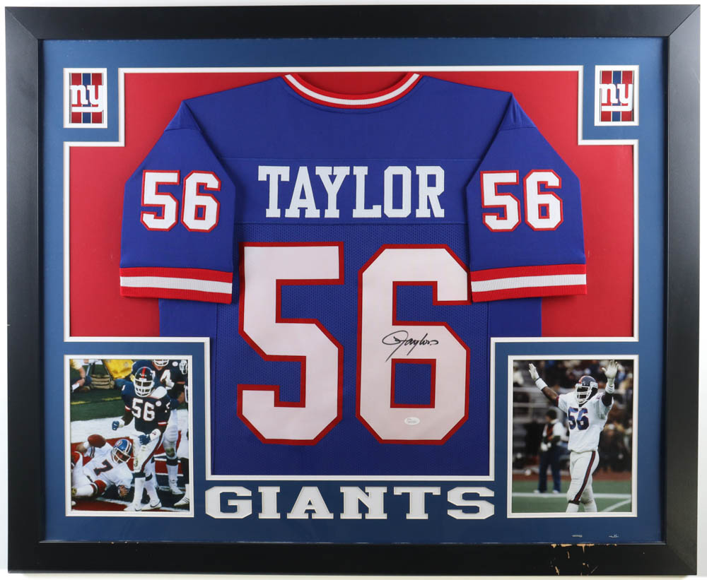 Custom framed display measures approximately 35.5" x 44" in size and features a custom jersey that is hand-signed by Lawrence Taylor (HOF). Display includes (2) unsigned 8x10 photos. Please note, display has wear on the bottom.