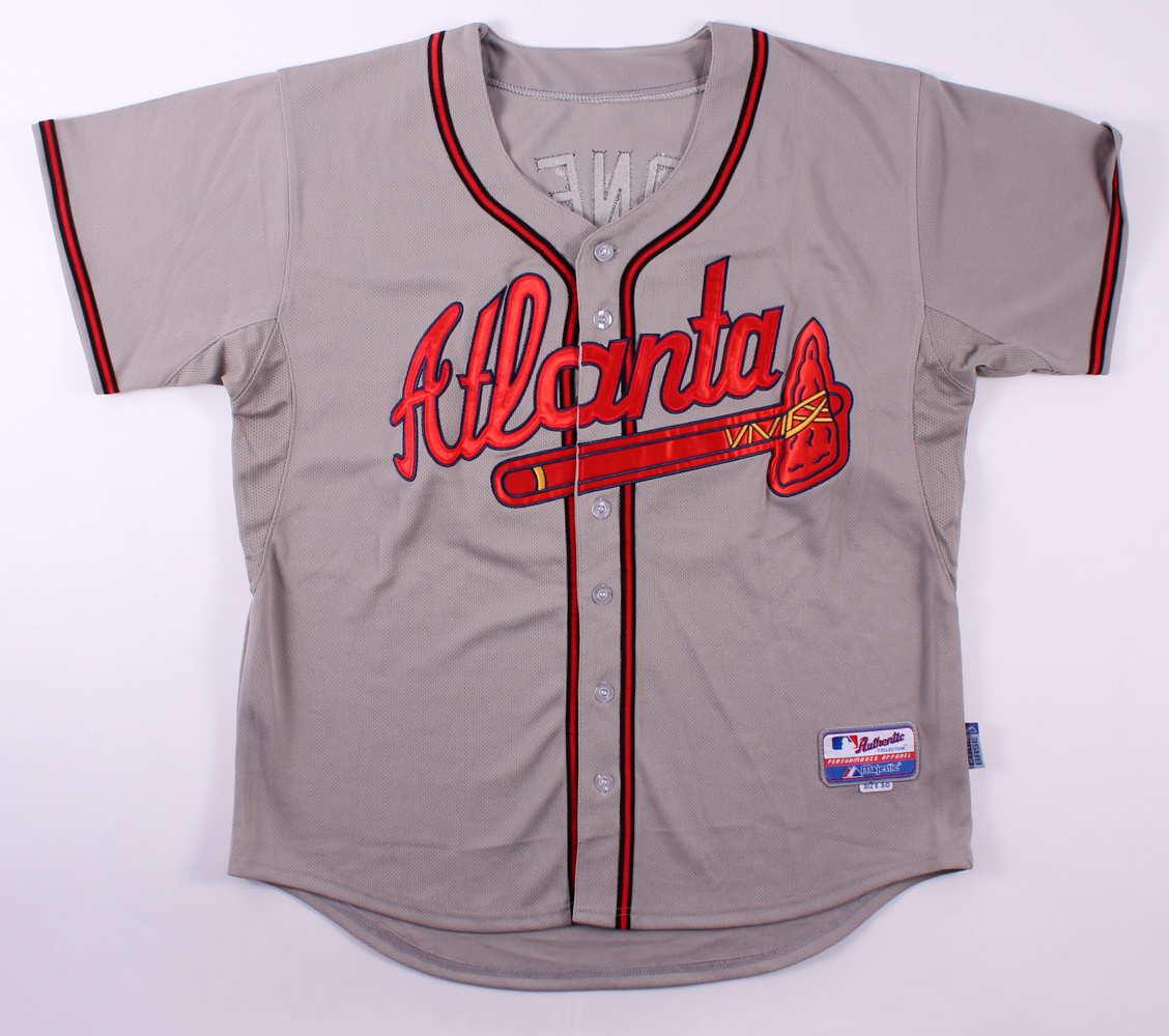 Majestic Authentic on-field style jersey. Everything is sewn on, size 50. Hand-signed in black felt-tip pen by Chipper Jones.