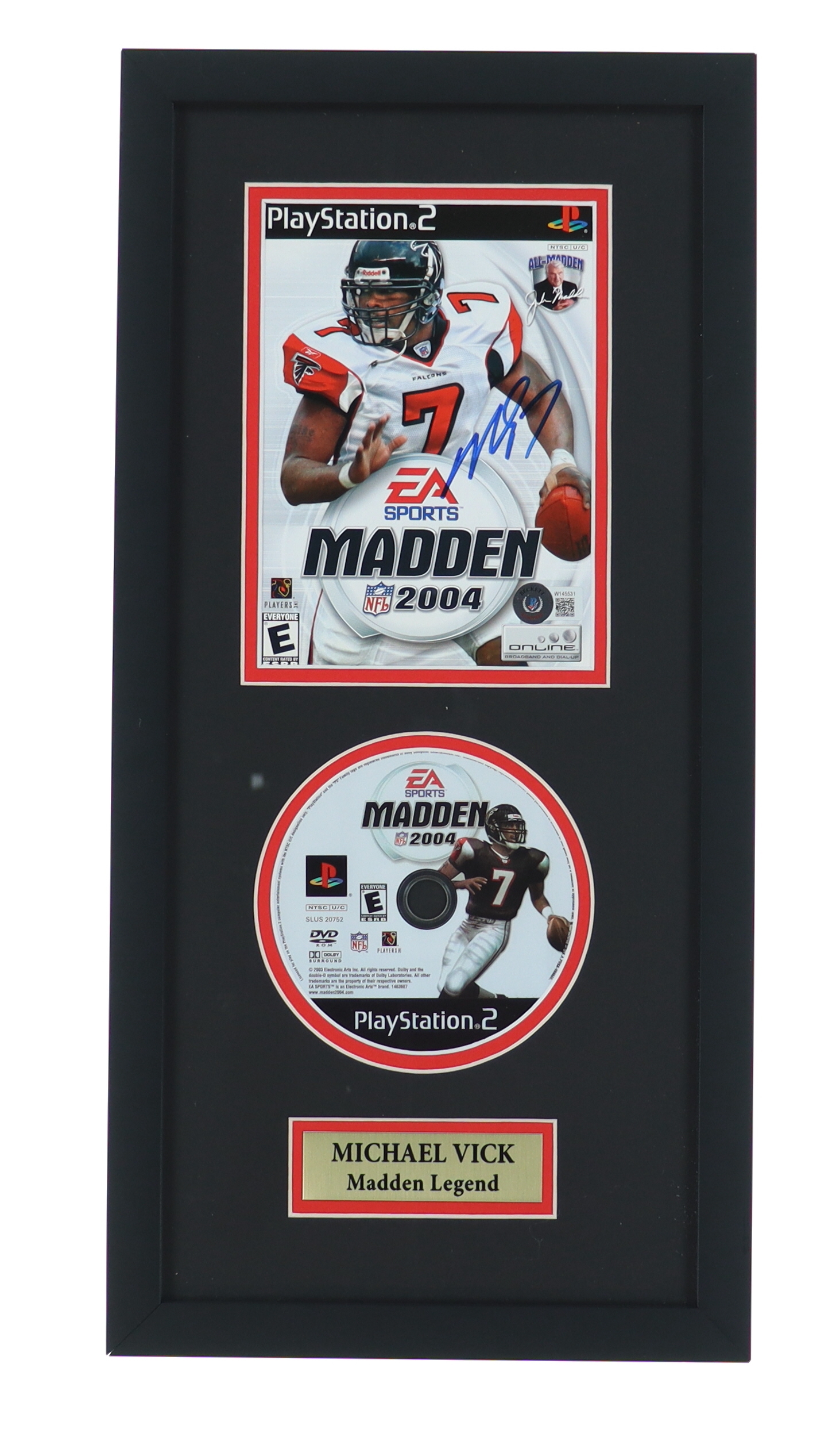 Custom framed display measures approximately 9.5" x 19" in size. Display features a Playstation 2 2004 Madden game booklet that is hand-signed by Michael Vick (Atlanta Falcons). The game CD is included as shown.