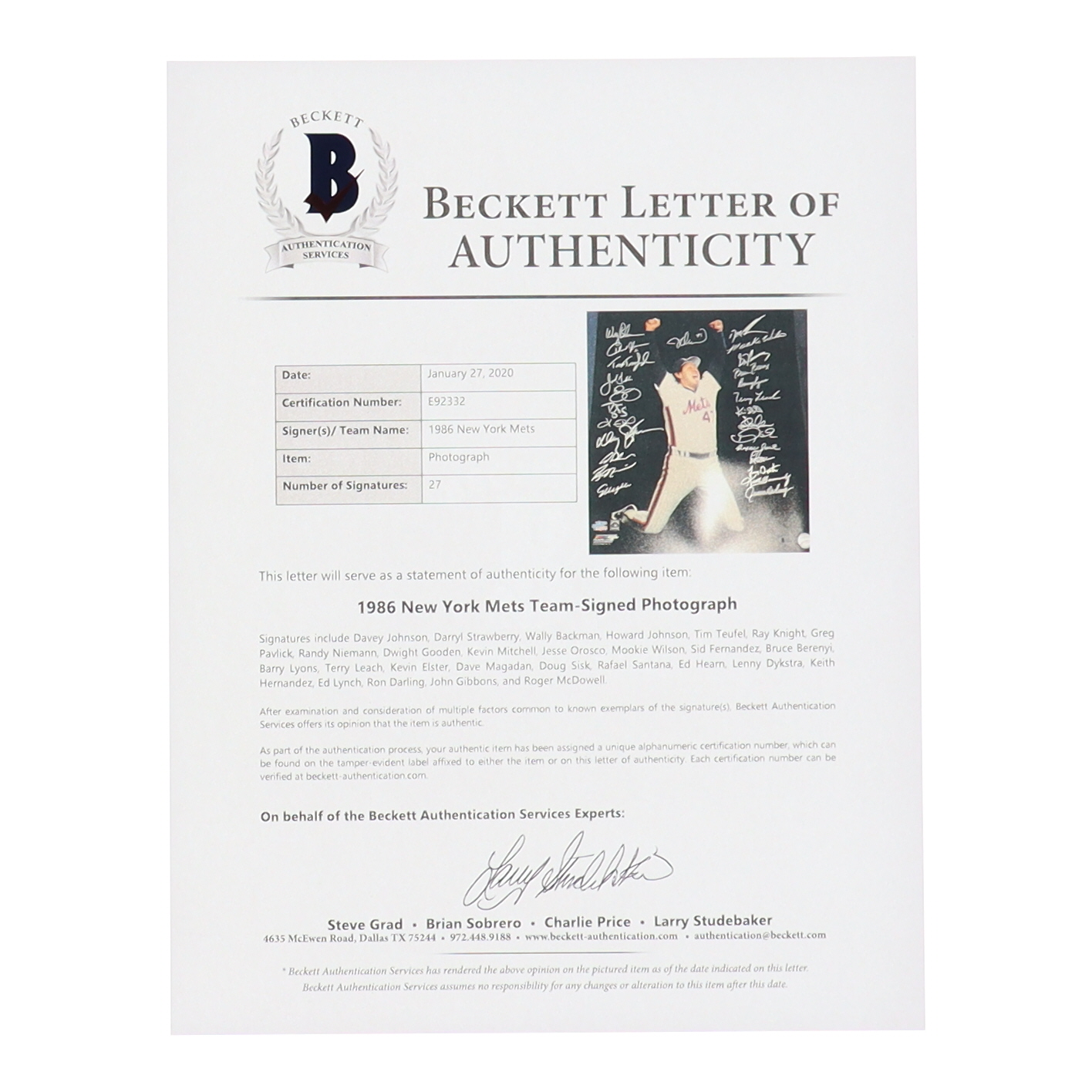 Photo measures 16" x 20" in size and has been hand-signed by (27) members of the 1986 New York Mets, with Davey Johnson, Darryl Strawberry, Wally Backman, Howard Johnson, Tim Teufel, Ray Knight, Greg Pavlick, Randy Niemann, Dwight Gooden, Kevin Mitchell, Jesse Orosco, Mookie Wilson, Sid Fernandez, Bruce Berenyi, Barry Lyons, Terry Leach, Kevin Elster, Dave Magadan, Doug Sisk, Rafael Santana, Ed Hearn, Lenny Dykstra, Keith Hernandez, Ed Lynch, Ron Darling, John Gibbons, and Roger McDowell.