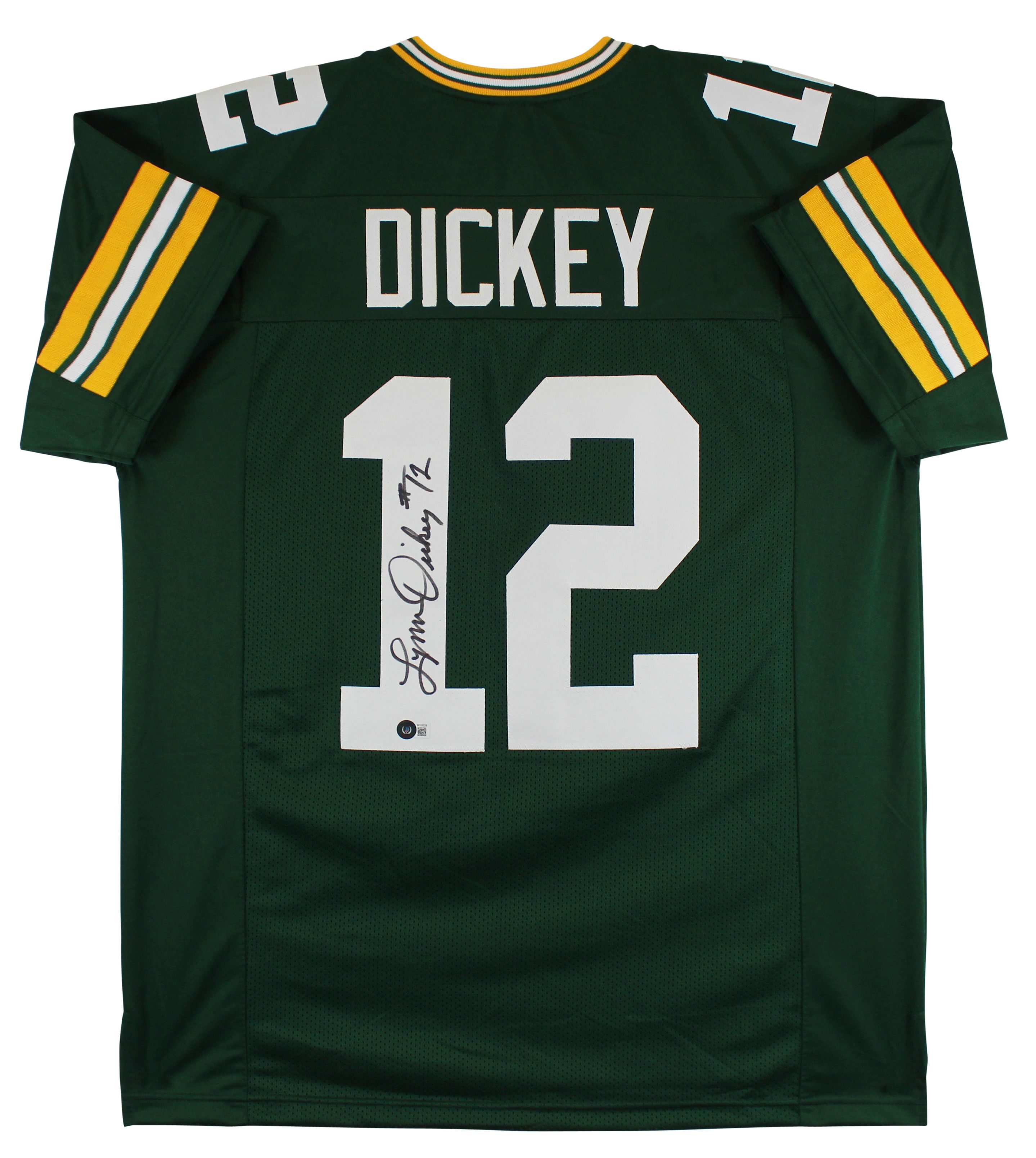 Custom jersey. Everything sewn on, size XL. Hand-signed by Lynn Dickey.