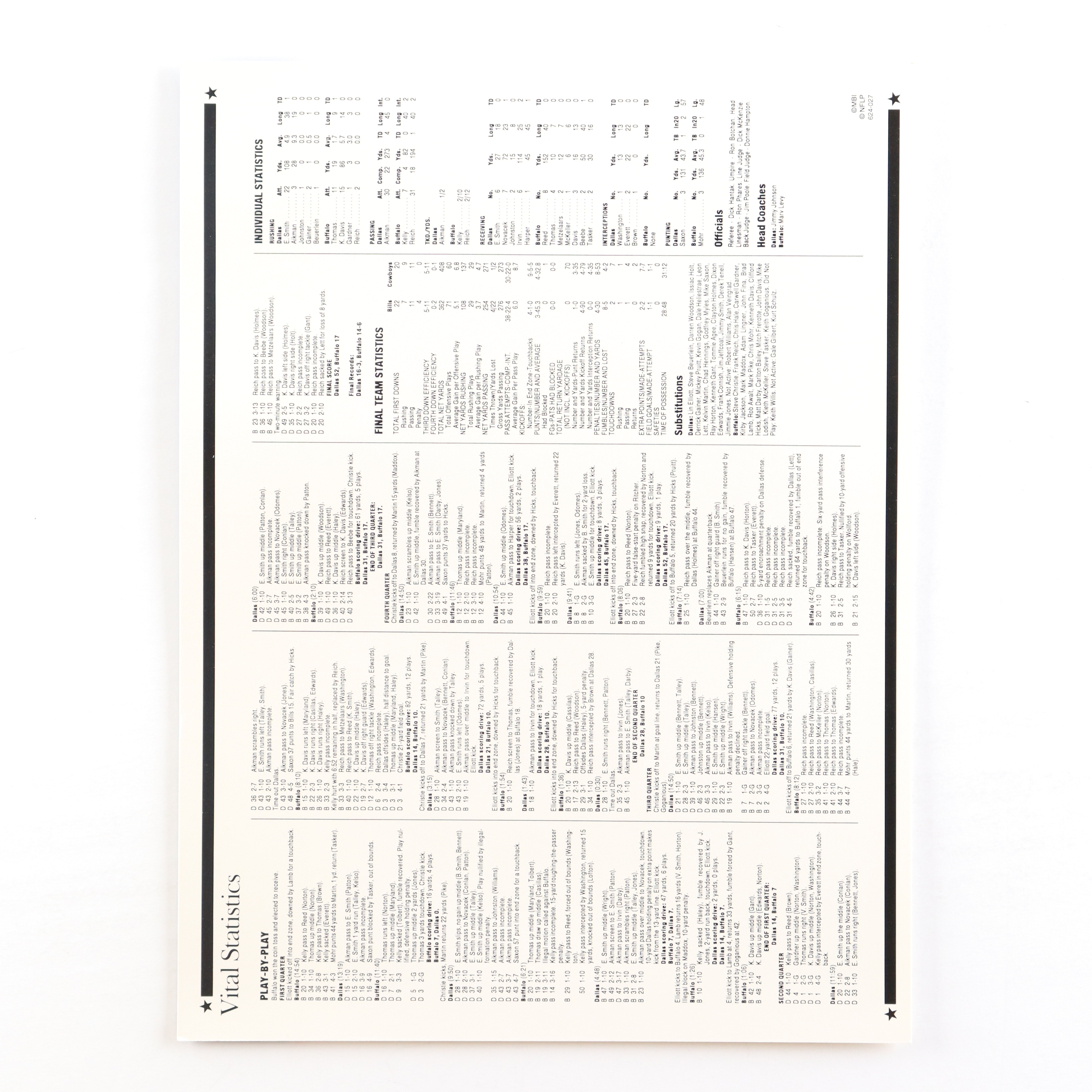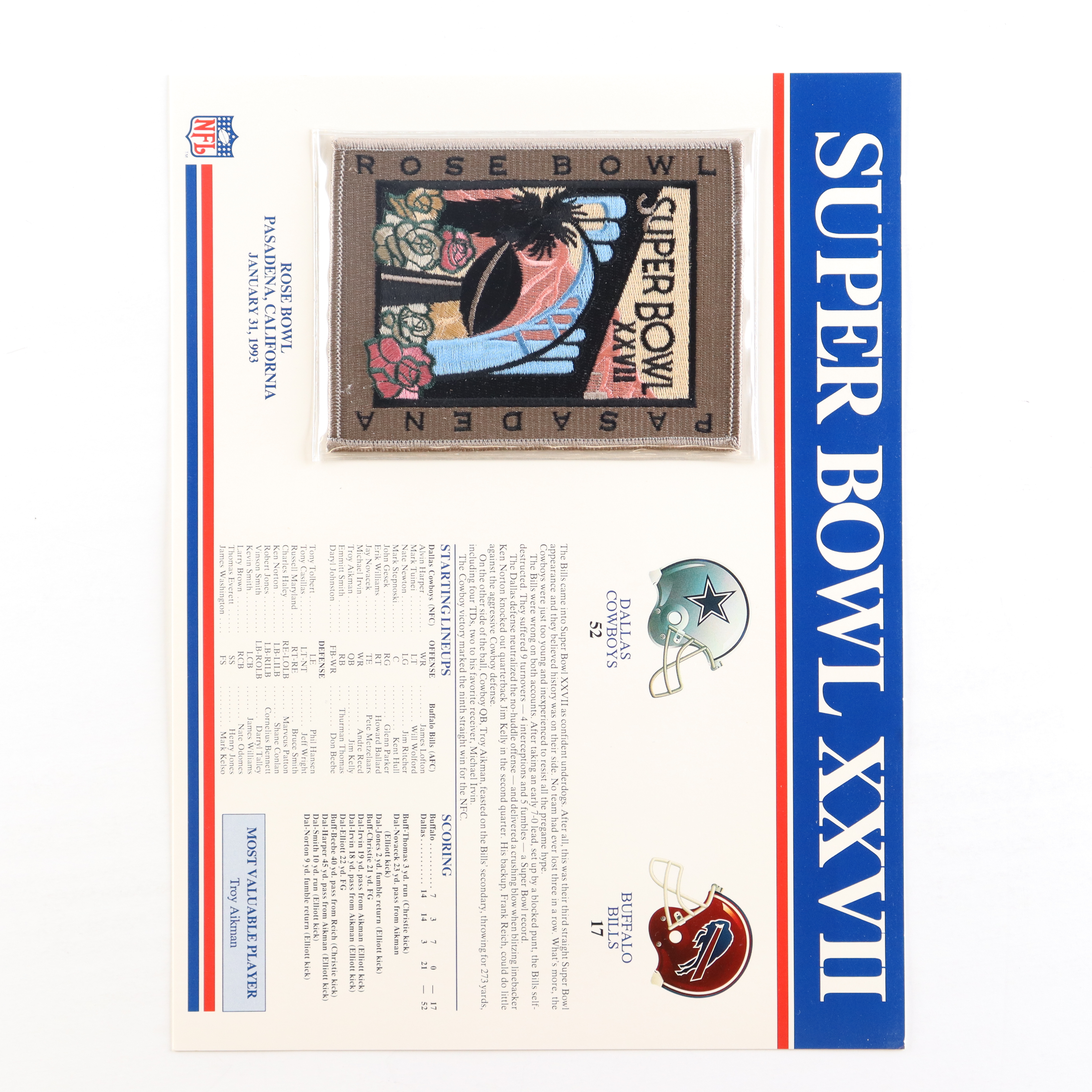 1993 Super Bowl XXVII commemorative stat card measures approximately 9" x 12" in size with stat sheet on the reverse. Includes cloth uniform patch as shown.
