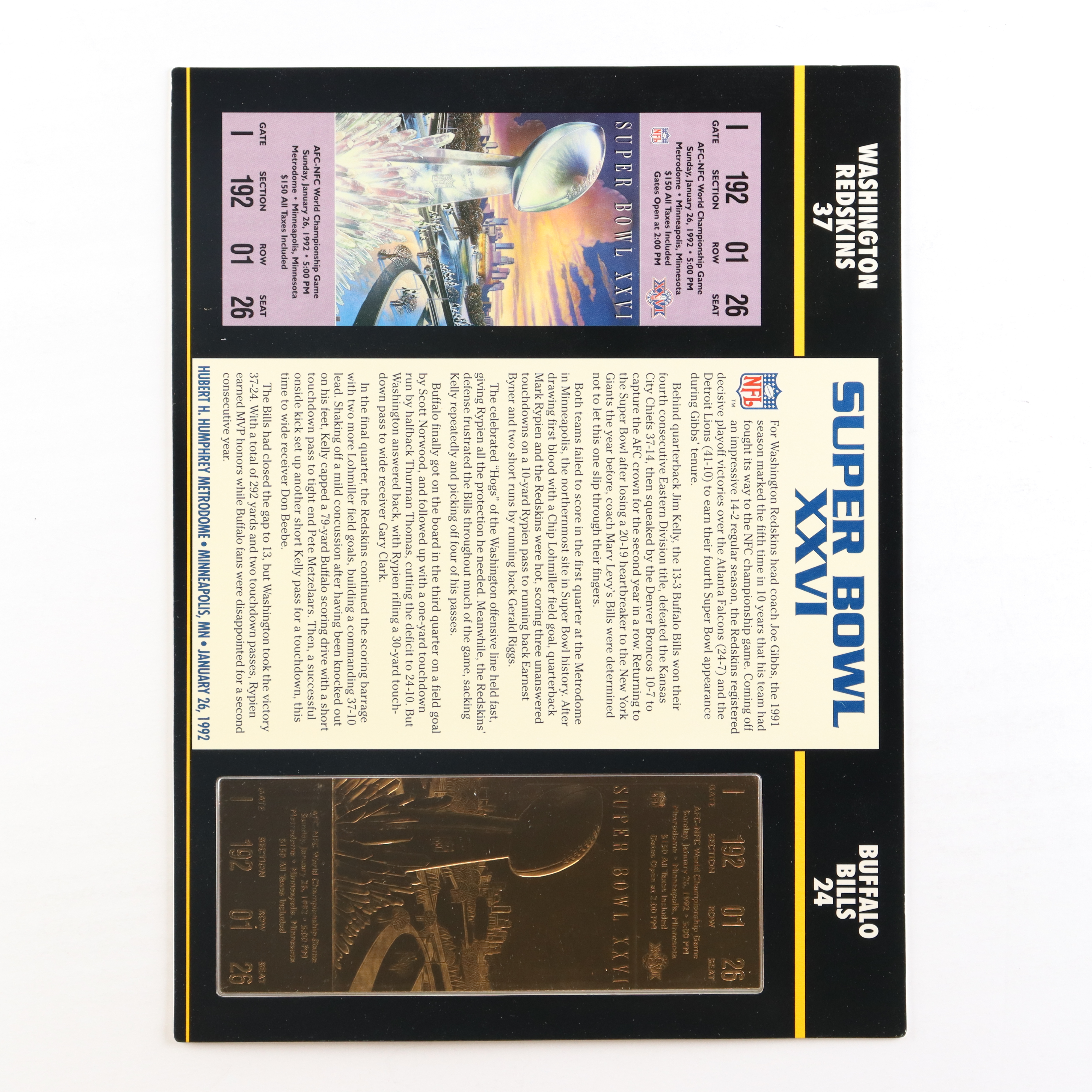 Display measures 9" x 12" in size and features a Super Bowl XXVI 23kt gold ticket.