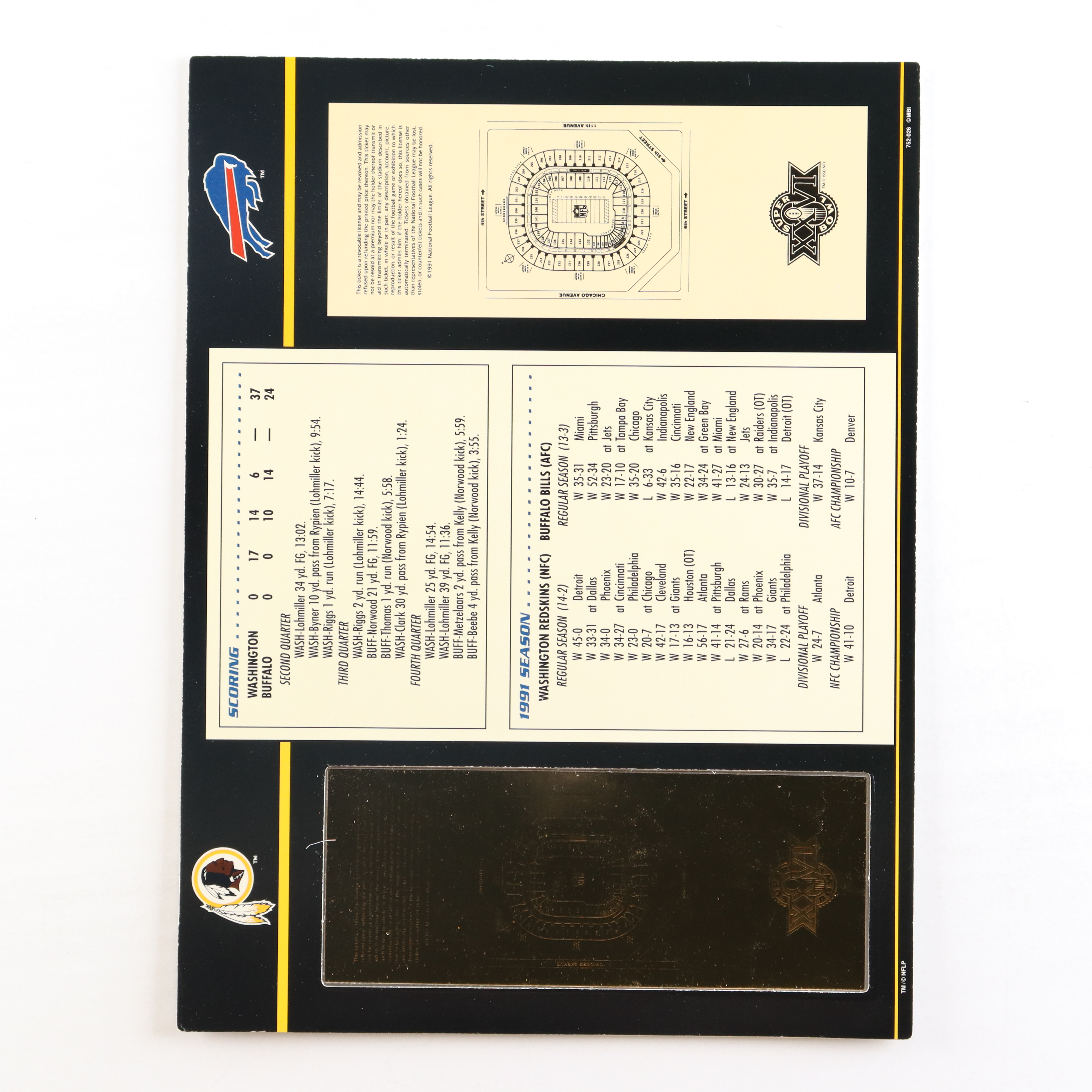 Super Bowl XXVI Commemorative 9x12 Score Card Display with 23kt Gold Ticket
