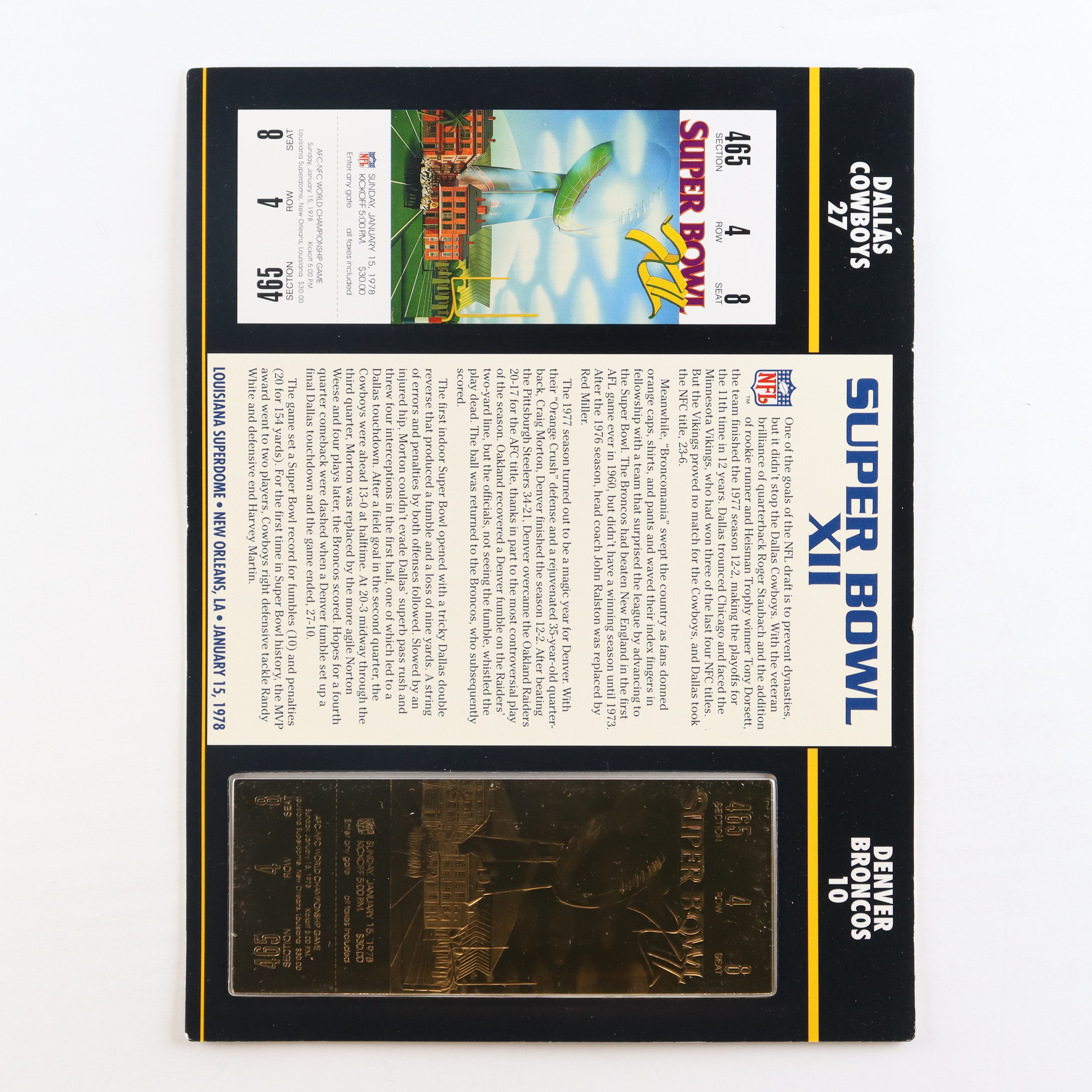 Super Bowl XII Commemorative 9x12 Score Card Display with 23kt Gold Ticket