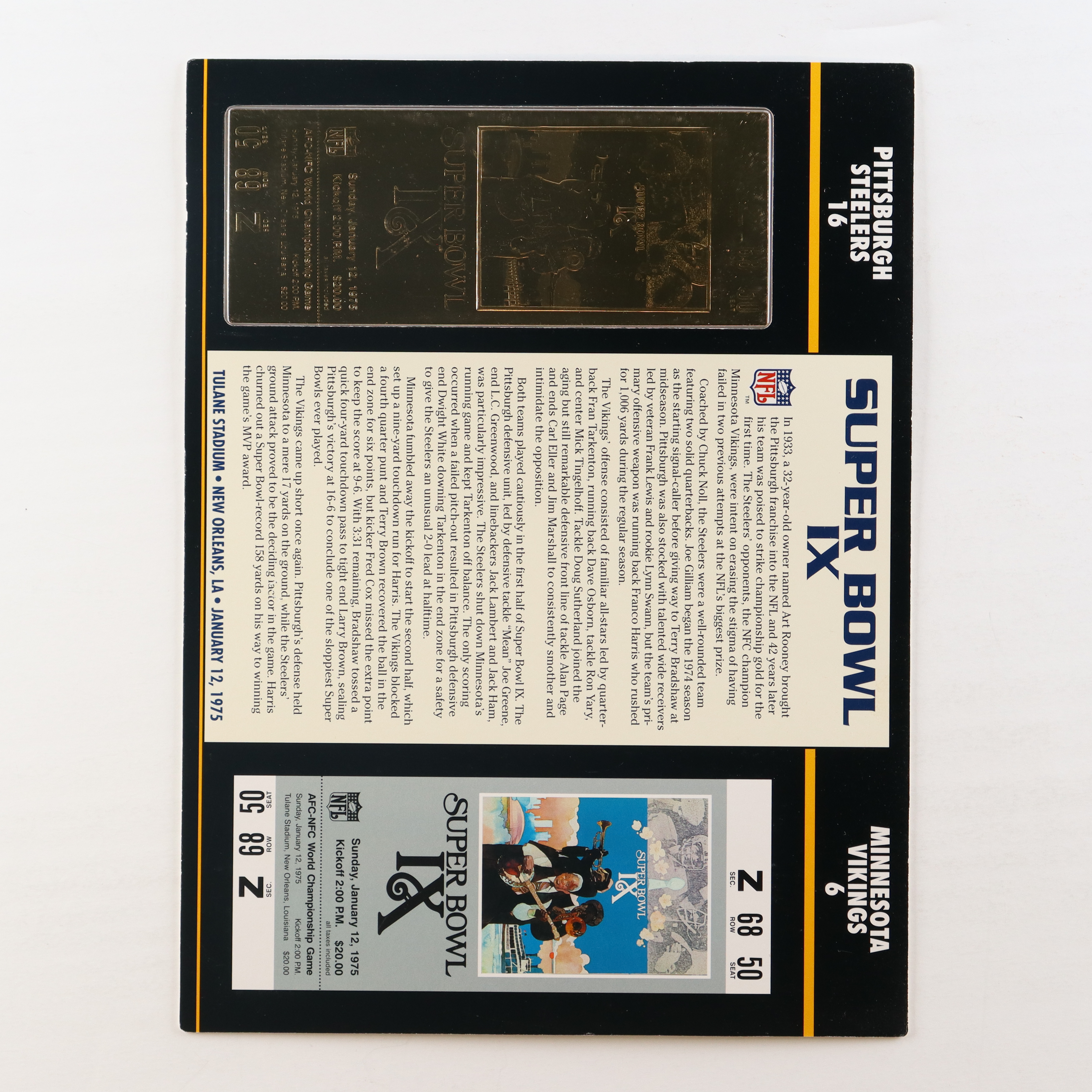 Display measures 9" x 12" in size and features a Super Bowl IX 23kt gold ticket.