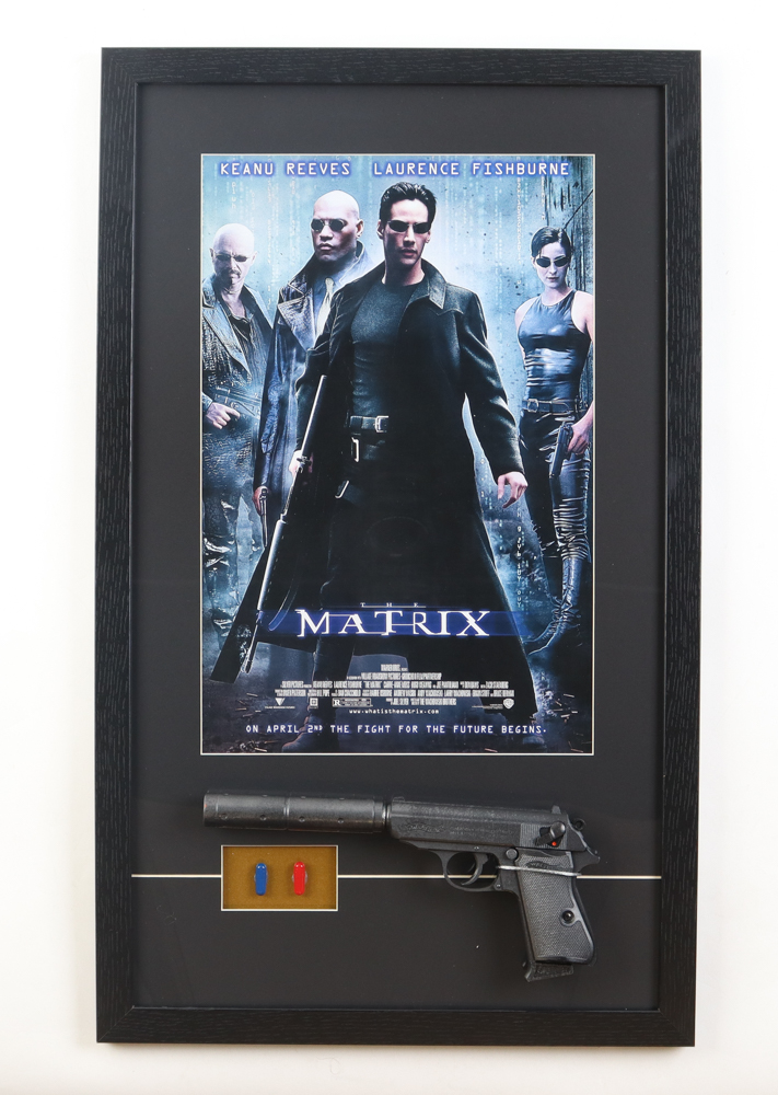 Custom frame measures 17" x 28" in size and features an unsigned print, a prop pistol and prop pills from the movie "The Matrix". Please note, the prop pills show signs of damage from handling. See photos for more details.