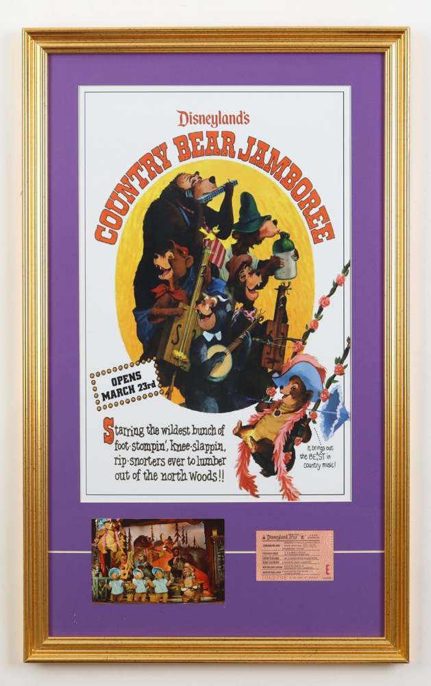 Custom framed display measures approximately 16" x 26" in size and features a Country Bear Jamboree print. Display also features a Disney World Postcard and Disney World Ticket Book.