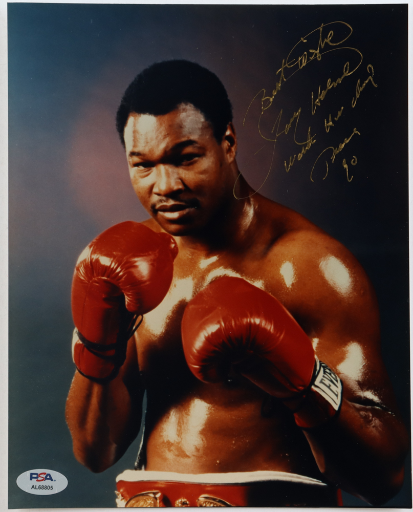 Photo measures 8" x 10" in size. Hand-signed and inscribed by Larry Holmes (HOF).