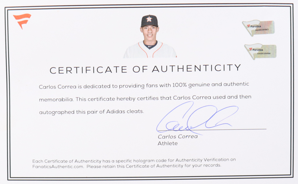 Carlos Correa Twice-Signed Game-Used Pair of Baseball Cleats (Fanatics)