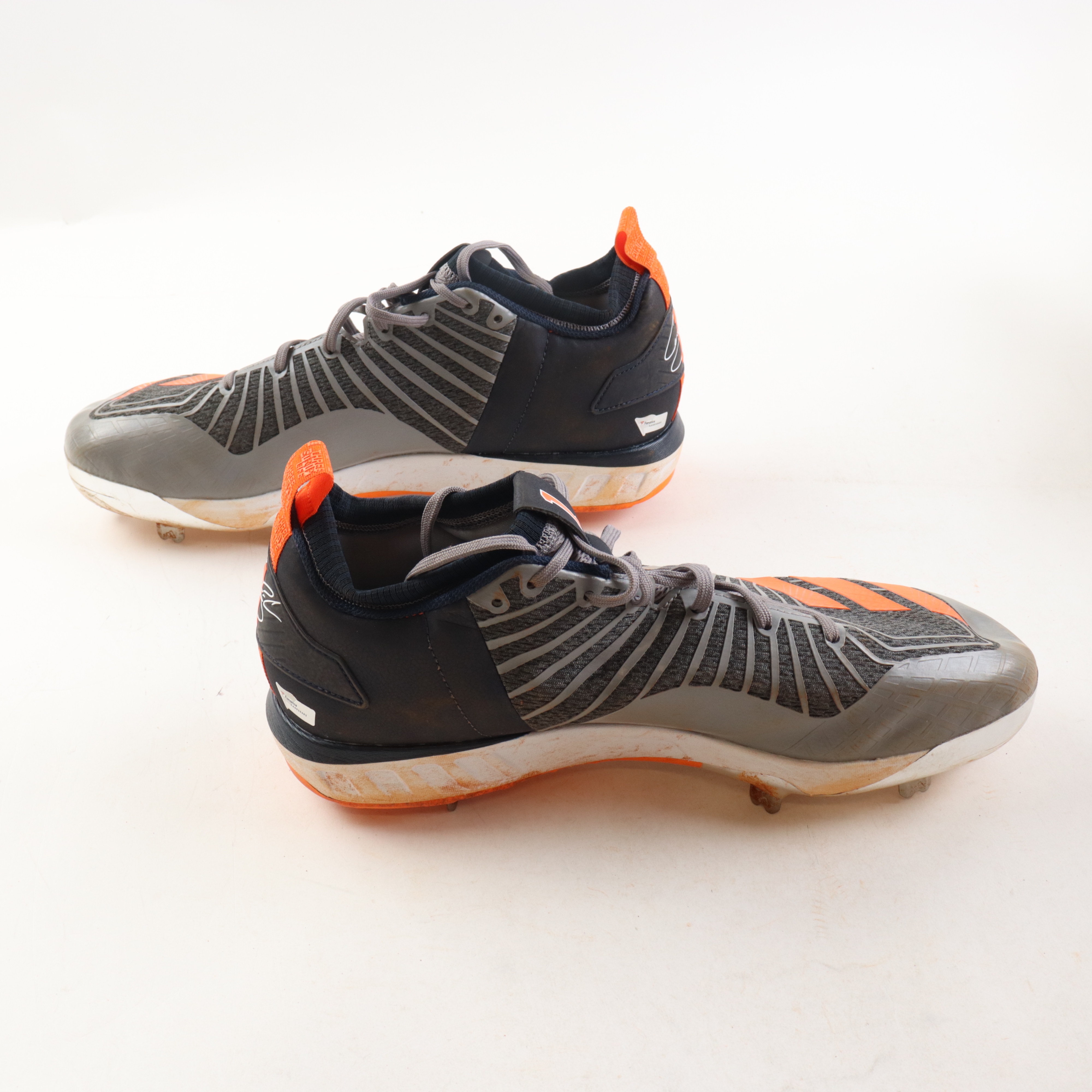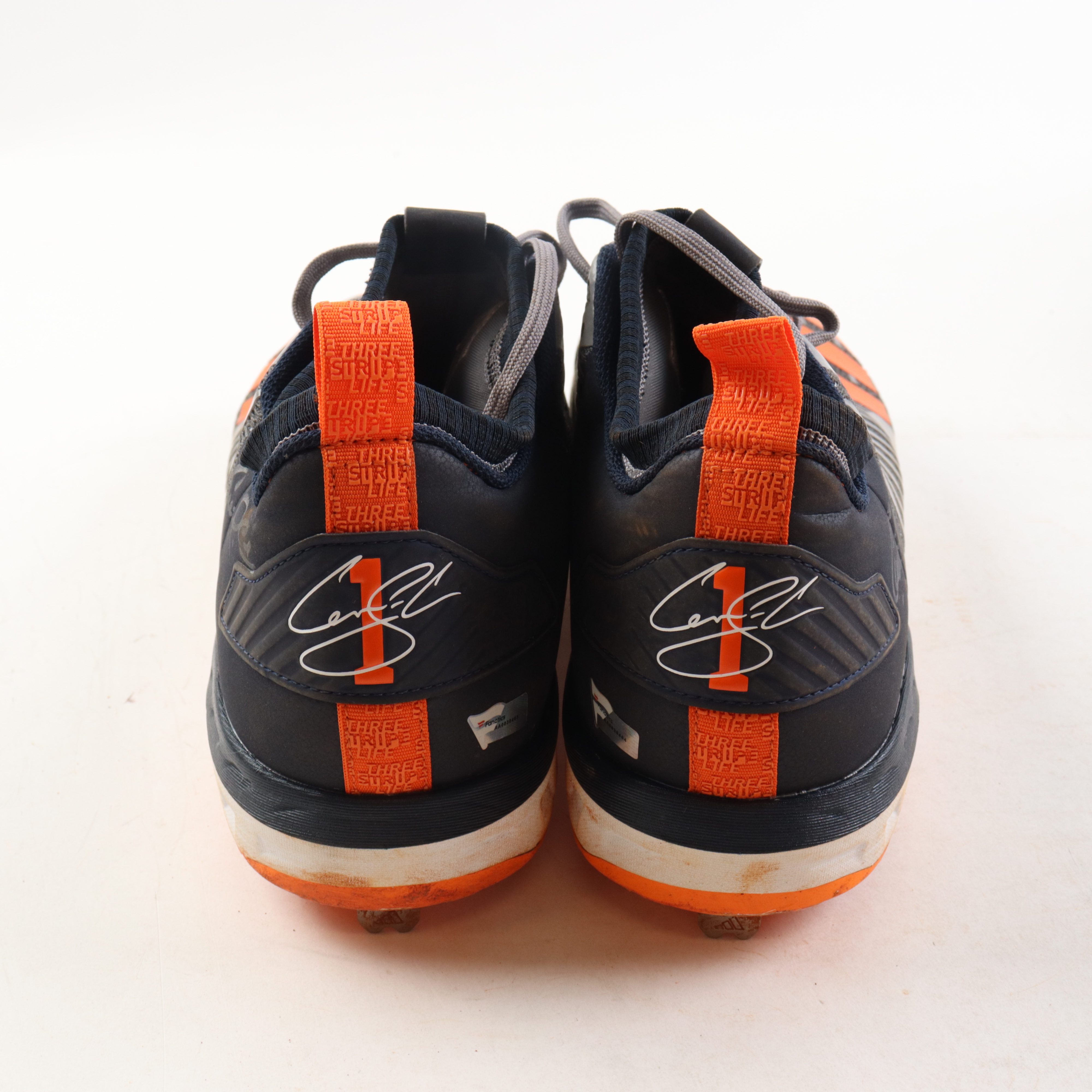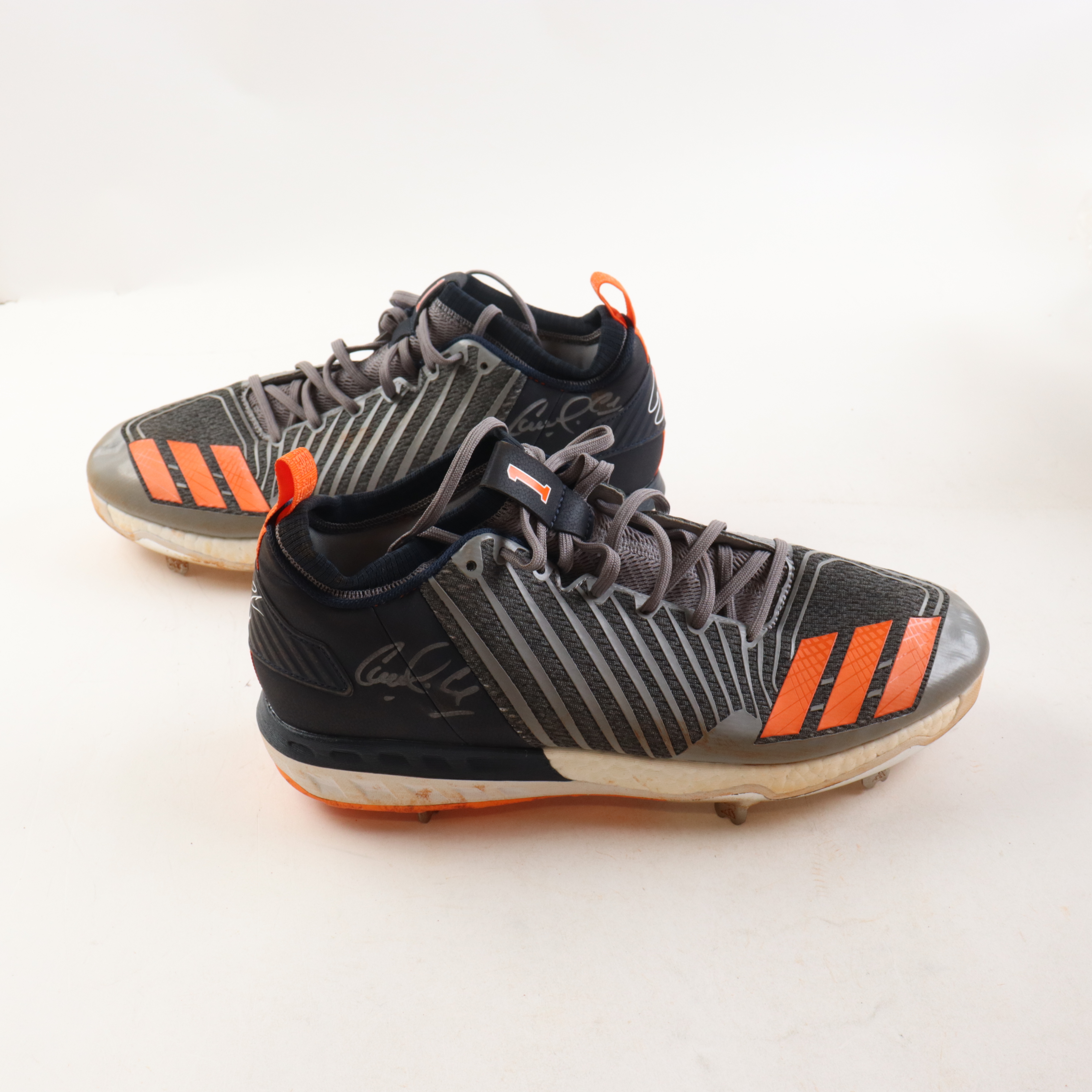 Pair of game-used Adidas baseball cleats, size 13. Both shoes have been hand-signed by Carlos Correa (Houston Astros).