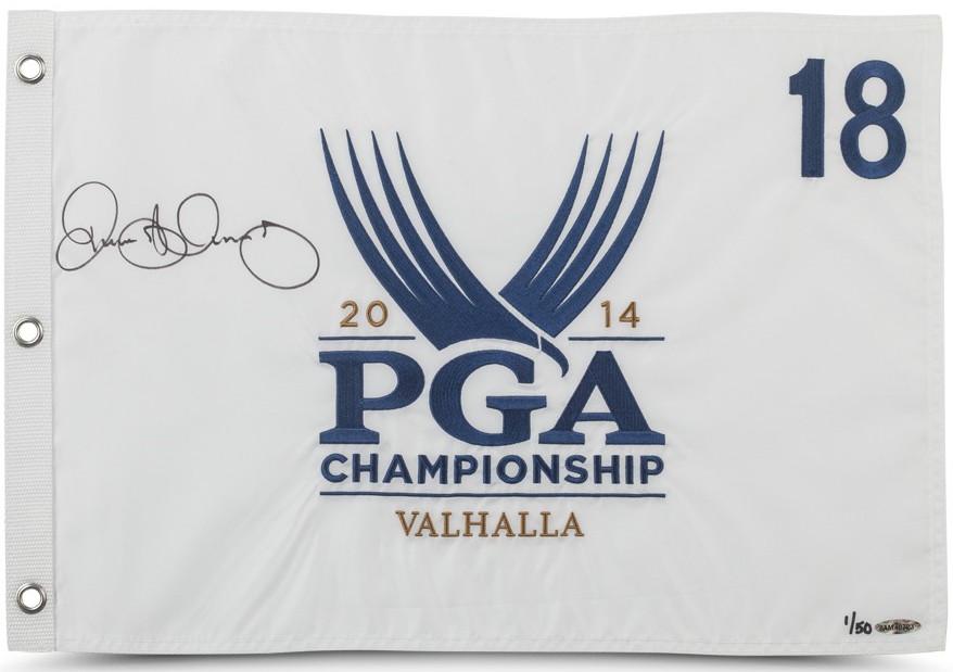 2014 PGA Championship pin flag has been hand-signed in black felt-tip pen by Rory McIlroy. The flag is a limited edition and has been hand-numbered #/50.