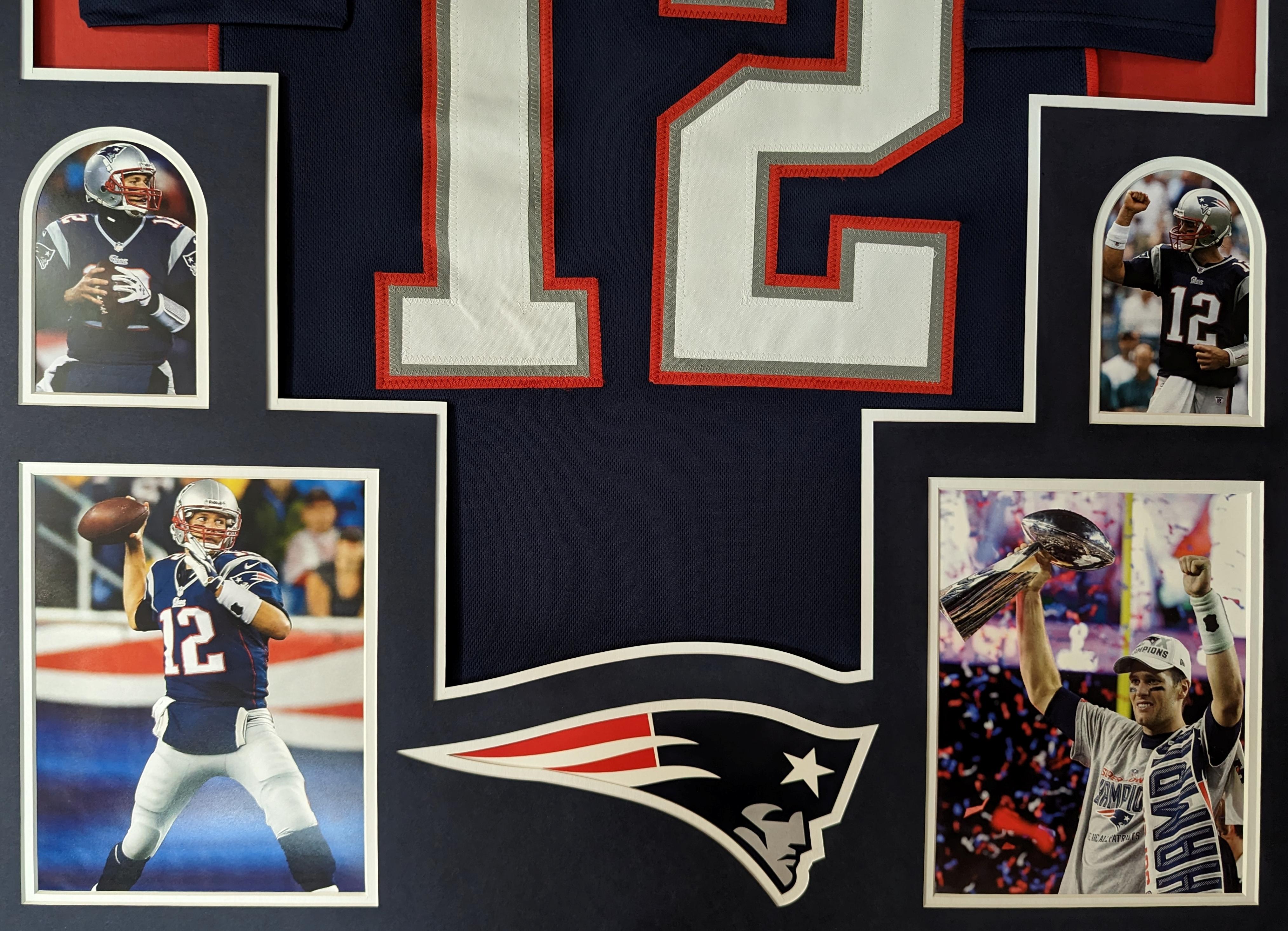 Custom framed jersey display measures 32" x 42" in size and features a Tom Brady New England Patriots jersey. Please note, the jersey is unsigned.
