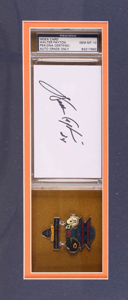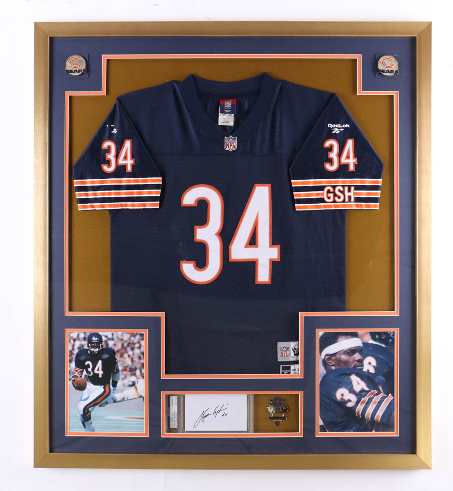 Custom frame measures 32" x 36" in size and features a cut that has been hand-signed by Walter Payton (D.1999, Chicago Bears, HOF). Frame also Includes Custom Jersey, (2) metal Bears Pins, (2) photos and Super Bowl XX pin.